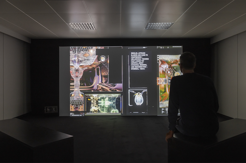 In step with contemporary dialogue on ecological art, ‘Hybrid Futures’ traffics in a concept of deep time that unites the existence of the pre-human natural world with fantasies of the post-human machine. Some works, like Crosslucid’s visual reimagining of the Ursula K. Le Guin story ‘Vaster Than Empires,’ vivisect the analogies found in science fiction between Artificial Intelligence and the consciousness of nature. Others, like Joey Holder’s 11-minute video ‘Abiogenesis,’ set the aesthetics of video games in conversation with visions of our future environment. A recent commission by Elektron and Haus der elektronischen Künste, ‘Abiogenesis’ imitates a video game’s loading page, with the “modules” of the download process representing the qualities of undersea creatures that will assist their survival in a post-apocalyptic world. Each animal has its own totemic and epistemic value, perhaps none so bewildering as the longevity of the volcano sponge. Had Caesar lived to see the memes about the Roman Empire, he would have celebrated his 2125th birthday—a mere hearty age for the volcano sponge, whose estimated lifespan reaches as high as 15,000 years. The deep time and oceanic depth of Holder’s creatures, too expansive for the human mind to fathom, is paradoxically capable of being “initialized” for simulation within a few minutes.