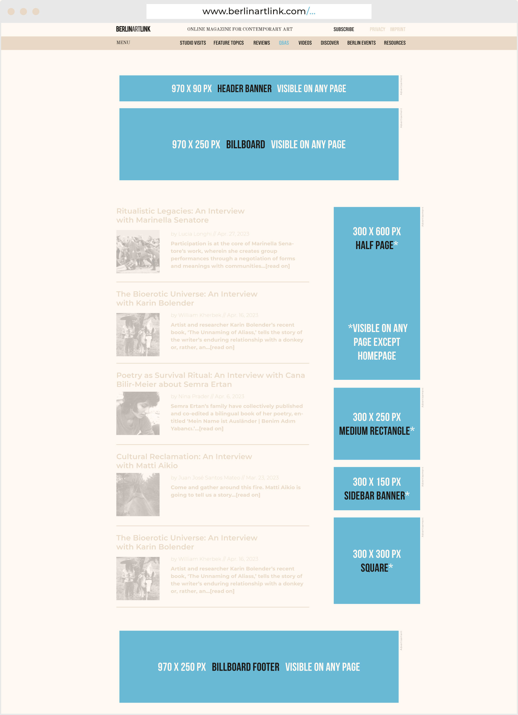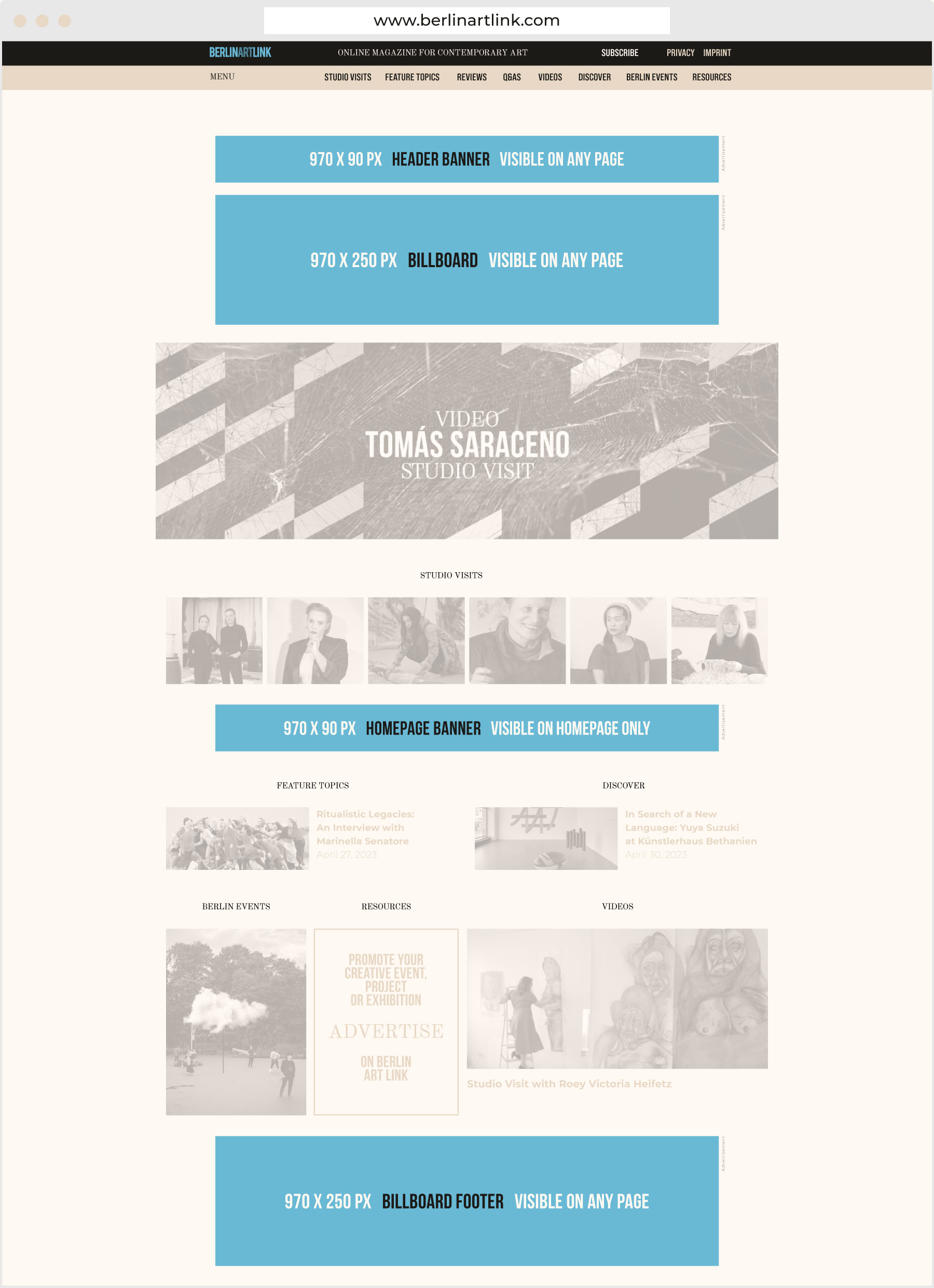 We receive up to 70.000 visits per month from influential curators, press, art professionals, collectors, artists and other cultural innovators around the globe, ensuring that your brand reaches an expansive, dedicated and influential creative audience. Advertising options start at just 200 Euros a month. Please direct all inquiries regarding sponsorship and advertising to advertise@berlinartlink.com.