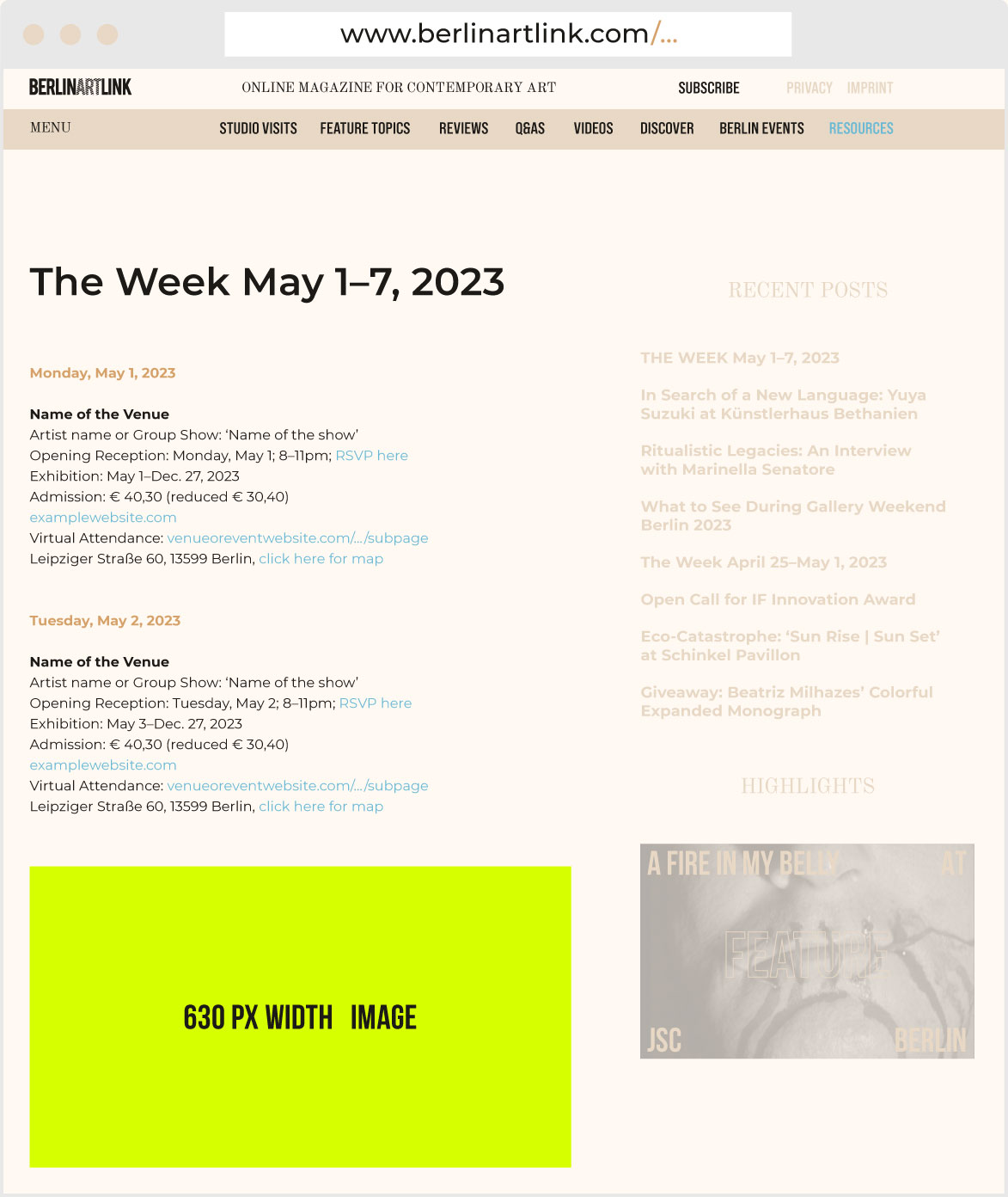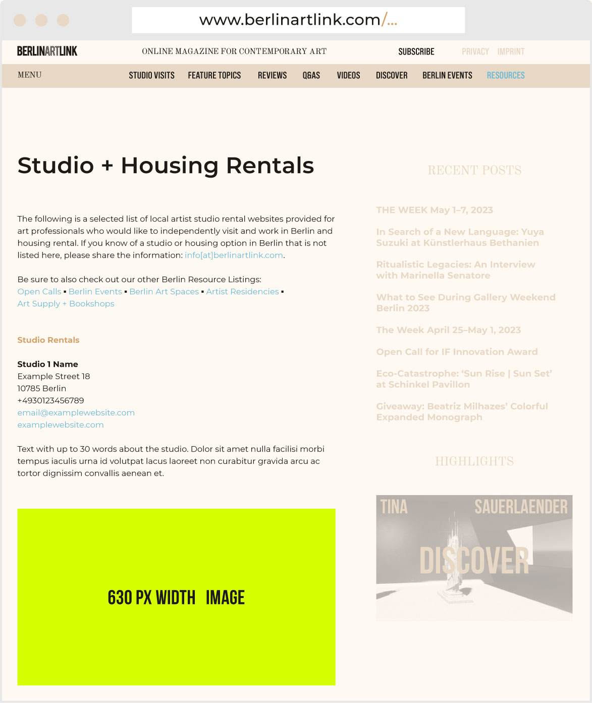 Published on Monday before the event in our weekly Berlin events listing The Week and in our weekly event newsletter with >5000 subscribers. Special feature – incl. image – on the apt Berlin Resources page for the entire duration of the event. Studio + Housing Rentals Listing for one year. We also offer packages tailored to your needs.