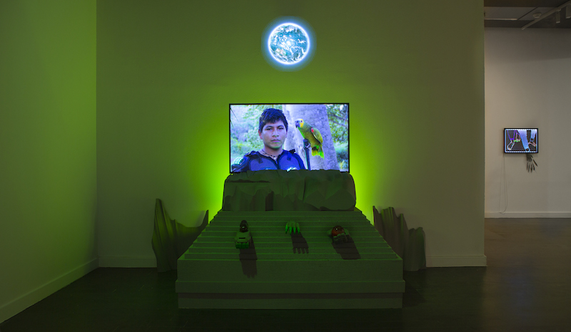PD: What I do through my work is a ritual. I see it as late-capitalism hacking—a stomach that digests elements from the system and rearranges them into a sci-fi aesthetic, but where, actually, everything comes from the present. I re-appropriate objects from the internet in a way that honors planetary memory. The digital turns what is alive into pixels, whereas I materialise what’s digital, in order to connect it with memory, as pixels of information coming into us from the sky. By chance I was in the Bolivian Chiquitanía doing a residency during the forest fires and I helped out at an animal rescue sanctuary, where an injured, half-blinded toucan kept appearing. I made a video of it as a container or depository of memory. The toucan appears in ‘Madre Drone’ (2019-20), where I give him the mythological quality of being an animal with the ability to acquire a new kind of vision. The toucan appears crying, which was inspired by the tears of the students blinded with teargas by the police at protests during the social uprising around that time.