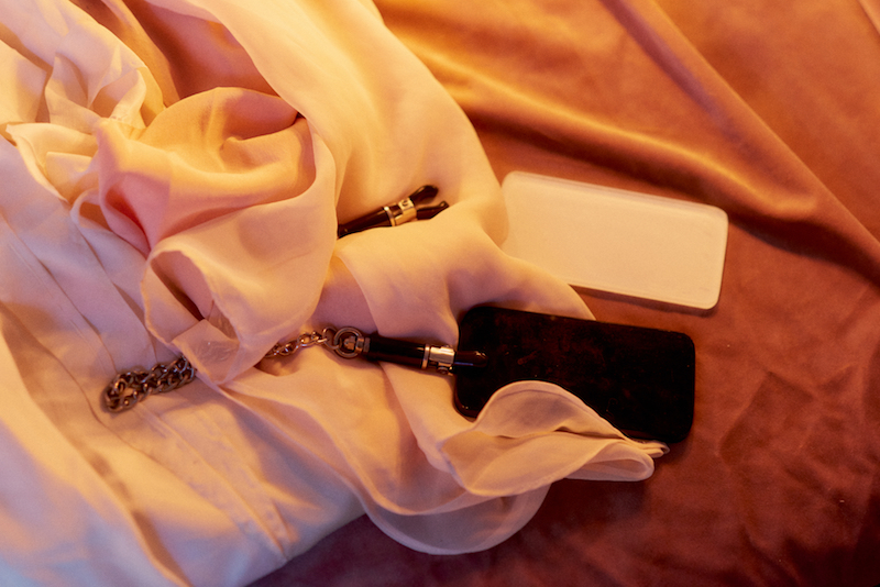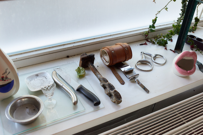 To say that one thing catches my eye is to choose between the tens of curious objects that litter the space: a long blonde wig on a mannequin’s head; a crystal chandelier lying arbitrarily on a staged bed; knives; handcuffs; a (real) cat and its cardboard-box bed; a gaping ceramic mouth; leather restraints; nipple clamps; a full-body nylon suit; a full-face mask; a studded headboard; mirrors; make-up; pills; framed photographic prints recalling Sans’ photography background; and endless wires that snake their way across the floor, tangled and connected to various screens displaying previous work, over which she is eager to launch into discussion. One thing that nearly all of the studio’s population of treasures have in common is their connection to desire and insubordination, and a feeling of being just outside the normalised realms of decency. There is a sense of stepping into a forbidden space, where boundaries, sexuality, kink, consent, mental health and substance use are explored boldly through physical, digital and online performances.