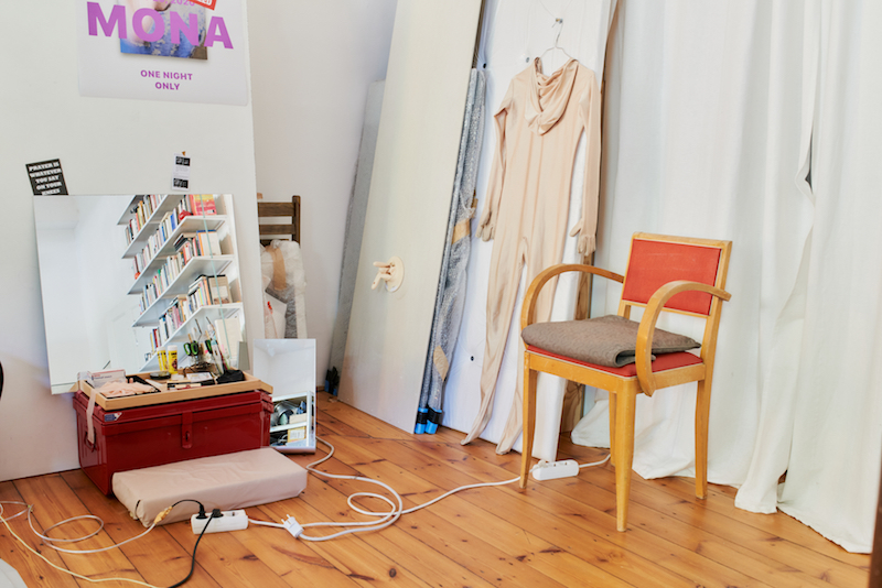 As we perch on the corner of the foam mattress, which we later learn is where she performs her prosthetic-wearing chatroom alter ego, Fette Sans (the pseudonym is a play on font names, but could easily be misconstrued for something more lurid in both German and French) turns on a screen and begins to tell us about the sets she builds for her performances. These “minimal settings” provide the environment for Sans to pre-record content that she then combines with live material, putting into question what is happening now and what is real — a thread that runs throughout her work. “I’m interested in how you keep residue of images,” she tells us. “Something you are experiencing in real time and something that you experience through a screen will essentially be stored in your memory the same way. There is no such thing as a oneness of memory and reality. So I construct reality through images.” Her work exists in two parts, she informs us: online—through videos—and through the leftover objects that relate to these performances.