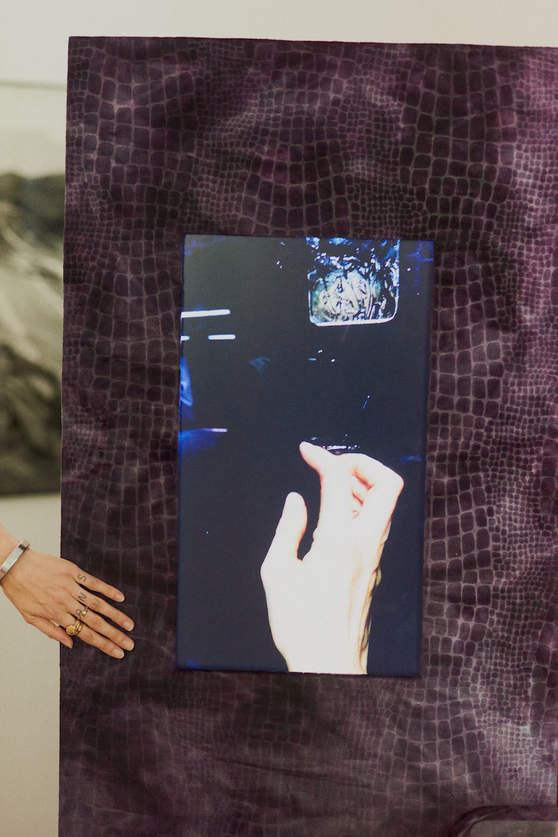 Walking over to a set, which she carpentered herself here in the studio, cushioned with the same purple velvet fabric as the sofa, Sans sticks her hand in a “glory hole” in the seat. When she pulls it out again, it is covered in lube. The structure was used in ‘Resonance of an awkward smile’, where Sans performed from inside a box in Ung-5, at an U-Bahn station in Cologne. The performances were both announced and unannounced, at night and during the day. Inside the box was also her laptop, which was connected to a TV and speakers, from which she played music and recordings she had taken of the people looking in. The dark fabric made the glass super reflective, meaning that “people walking past would see themselves before seeing me, not expecting to see a person in a box, creating this weird tension of both the theatricality of me and of them being observed by me.” Exercising eye contact in an unthreatening way, Sans created moments of interaction where it was unclear who was observing whom. She smeared lube and wrote her phone number across the glass, inviting onlookers to text and enter into conversation with her. Sans often gives out her phone number in live and online performances, delivering her end of the sexually-implied transaction. After each performance, Sans would store pills that she had made inside, meaning the installation evolved throughout the month that she was in there. Now, the screen is paused on a frame of a selfie of the artist over-imposed with magenta text that reads: “Yes, at this moment I’m only myself sinking into something darker than myself.”