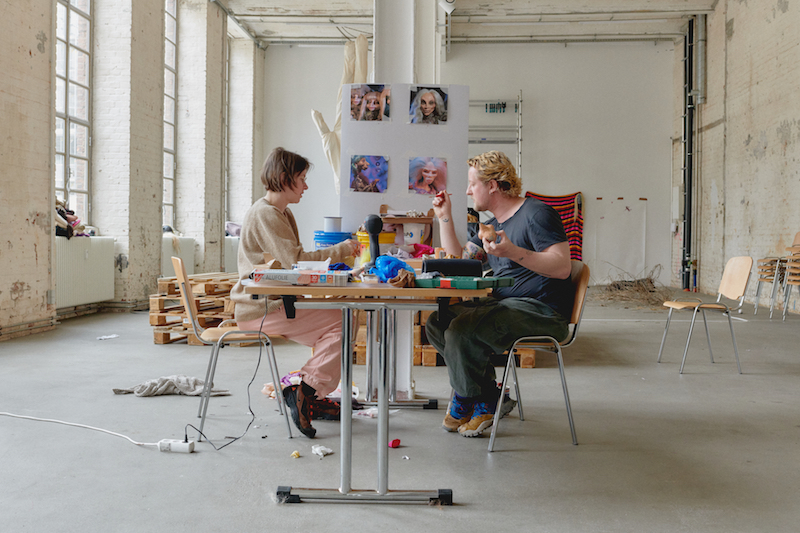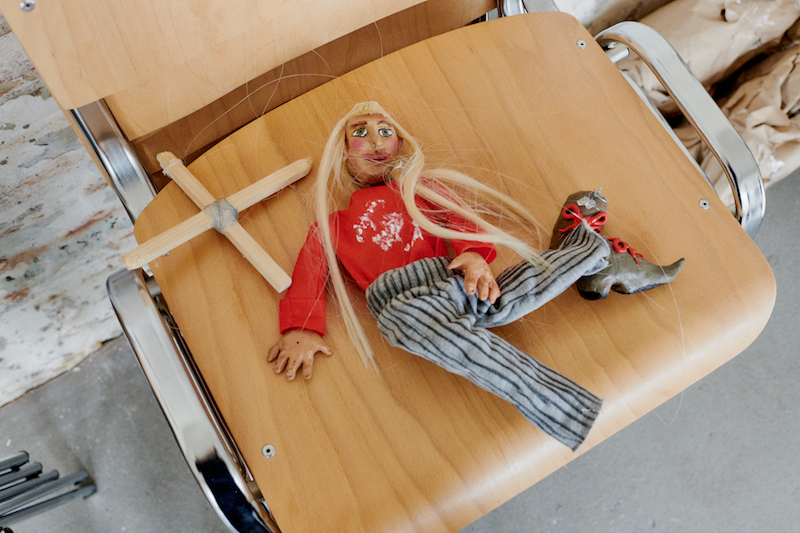 Both of Cammisa Buerhaus’ hands were busy outfitting the puppet she was working on. The layers of stiff silk on its miniature skirt were “giving Issey Miyake,” we mused, as Colin Self joked with Buerhaus. They are old friends and collaborators on Self’s upcoming exhibition ‘The Lemniscatic Elliptic.’ Self’s motley crew of string-suspended characters—some from their personal archive and some crafted during their ongoing residency at Callie’s—looked down on us. The puppets make up what Self calls “the Council,” and have been guiding them in trans-dimensional travel.