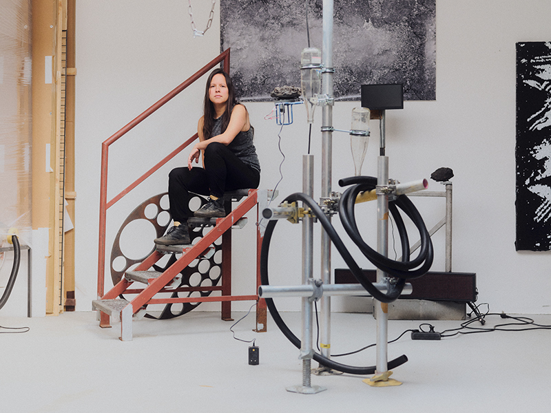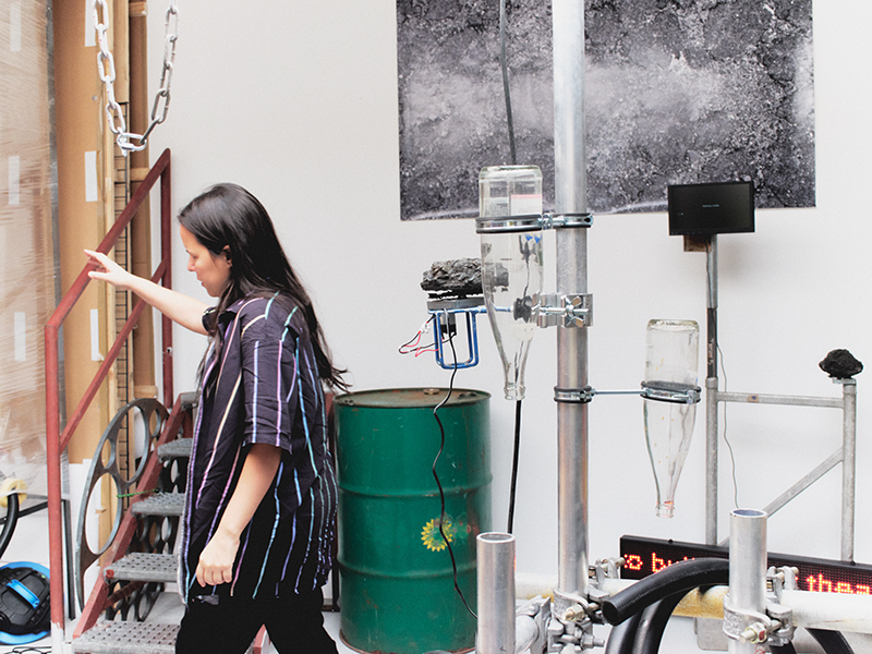 Working with creative recycling processes and circular movements, Alenso aims to emphasize the connection between society, natural resource extraction and pollution. The rotating objects and closed loops of matter flowing through the installations materialize the artist’s preoccupation with the ways in which man-made systems work, and how we can collectively escape their devastating circuits. “I aim to provoke an experience, a reflection; to reveal alternative narratives around current and historical socio-ecological scenarios, which arise from the very materiality of the objects,” she adds.