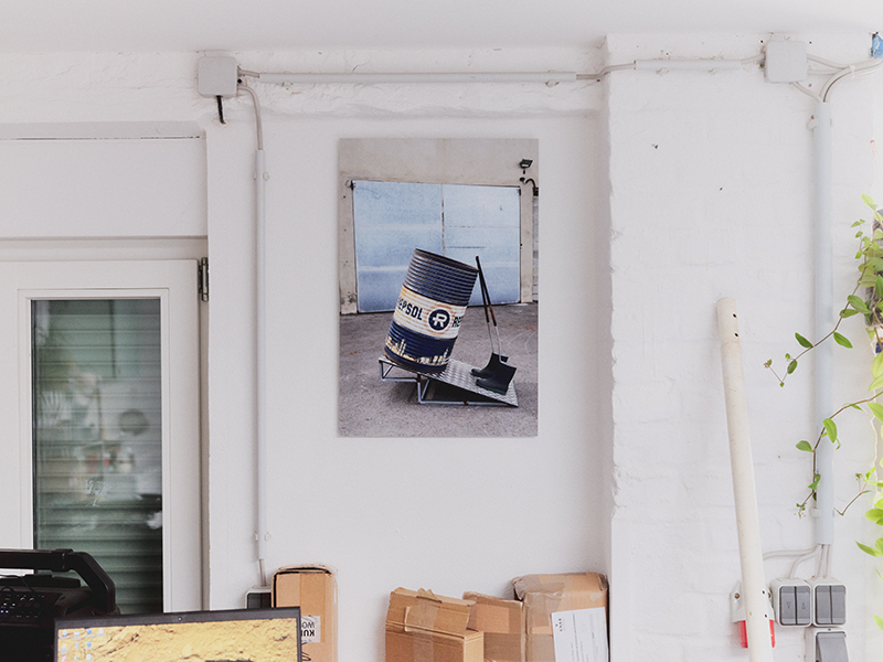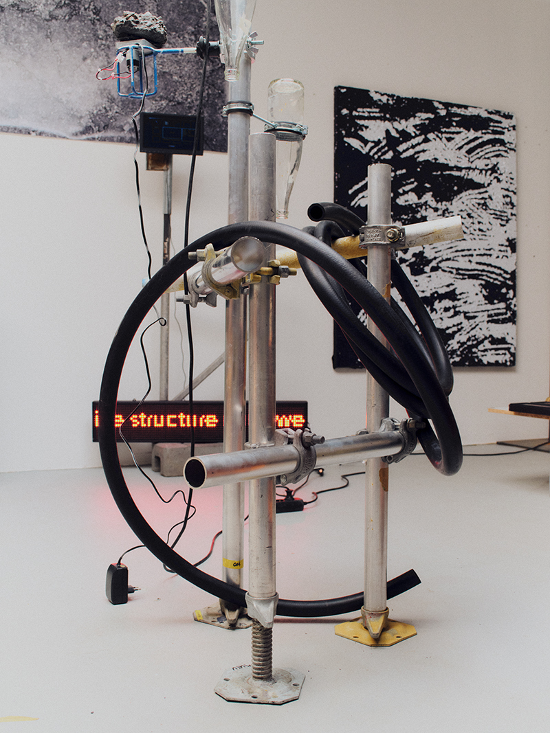 Her work-in-progress, ‘El resplandor los dejó ciegos’ (‘The Shining Blinded Them’), rests under an overhead window from which sunlight generously pours into the room. The artwork is set to be presented in the group show ‘Cabilla‘ at TEA Tenerife Espacio de las Artes in the Canary Islands—a project by Sol Calero exploring modernity in Venezuela that resulted from mass immigration from the Canary Islands, accompanied by a transfer of economic practices and images. Typical for Alenso’s practice, the artwork is a delicately balanced assemblage of industrial and mass production debris: metal rods, rubber hoses, fuel pumps, a couple of asphalt stones and upturned water bottles. “Water is always the most important,” she explains the latter, “not only for human bodies but for almost all industrial processes, so water is very vulnerable to contamination.”