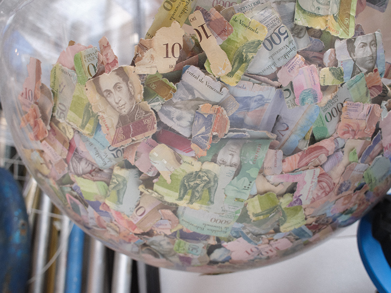 Alenso’s artistic language has been identified as “petrocultural imaginary,” pointing to the way she addresses the consequences that the petroleum industry has on all aspects of society and the environment. A Venezuelan who moved to Germany in the wake of the worst economic crisis in the history of her home country, she astutely communicates, through her artworks, the implications of the over-extraction of oil and other resources. Her multimedia installation ‘1,000,000%’ (2015-2018), titled in reference to Venezuela’s recent hyperinflation that rendered gasoline more affordable than a bottle of water, collates found objects as building blocks of a four-dimensional scene that engages (or rather aggravates) the senses, to capture the idea of a system in crisis. Recreating the once popular lottery game ‘Ciclón del dinero,’ the airflow coming from a leaf blower tumbles useless Venezuelan bolívars inside a plastic booth and gradually shreds them into dust. The ear-piercingly loud mechanism is joined by the panicking voice of a Chicago Stock Exchange broker blaring from a speaker placed in a pungent oil barrel. The interconnected pieces of the installation become associated with the larger picture; brutality and fragility take turns reflecting the tragic failure of capitalism.