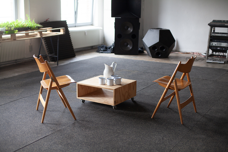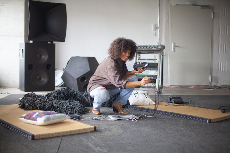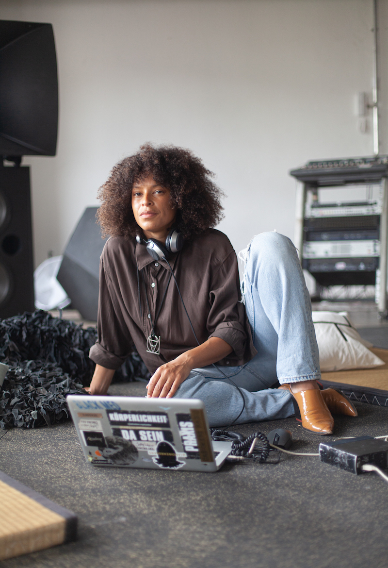 With this transition came a shift in the vocabulary of her practice. Lewis ceased to be a performer and became a “host.” Her audience came to consist of “visitors” or “guests.” These changes are not only semantic; they serve to structure the relationship between herself and the people she wishes to engage. Another effect of this transition was a gradual shift out of the dance scene into the art world. These days this change has become even more pronounced. For the first time, Lewis has her own studio. She is the first of a number of artists participating in a residency at Callie’s, a new self-guided program that was opened just before the pandemic closed most of the art world down. Though the expansive space is almost bare, the effect of having a regular workplace has been, explains the artist, “transformative.” The studio is a central meeting space, an incubator for collaboration and place for testing ideas. During productions, collaborators set up temporary work stations in the third floor, 200-square-meter setting. Lewis motions to a wall where long-time collaborator Dirk Bell might map out drawings or to the desk at which another collaborator sits to work on garments. At the back wall of the second room stand two ominous custom-built speakers made by Dirk Bell and Mo Stern. These sculptural structures were part of a performance and installation called ‘Scalable Skeletal Escalator’ at Kunsthalle Zurich in 2020.