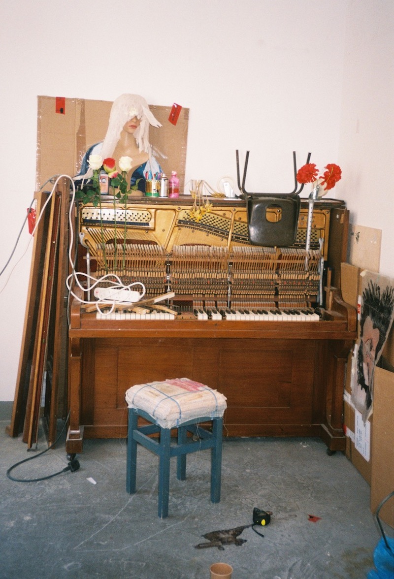 A piano with some of its panels removed and innards exposed sits in Jesse Darling’s Berlin studio. It’s a broken piano he got for free, not exactly material for a new sculpture (at least, not yet). When I visited, his studio contained more “abortions, miscarriages and leftovers” than works-in-progress. The piano, instead, aptly summarizes his exploration of vulnerability: be it the impermanence of material things or the fragility that always accompanies any claims to grandiosity or heroism. “I just took about four screws out. It seems sad, how easy it is to take a piano apart,” he told me, then demonstrated. Discarded, impermanent and fragile objects are often his sculptures’ materials, and can be seen around the artist’s studio. He sees his practice as “arranging garbage into patterns, whether literally or not.” It’s a process that offers an alternative to the heroism, machoism and even athleticism that have often informed Western sculptural practices.