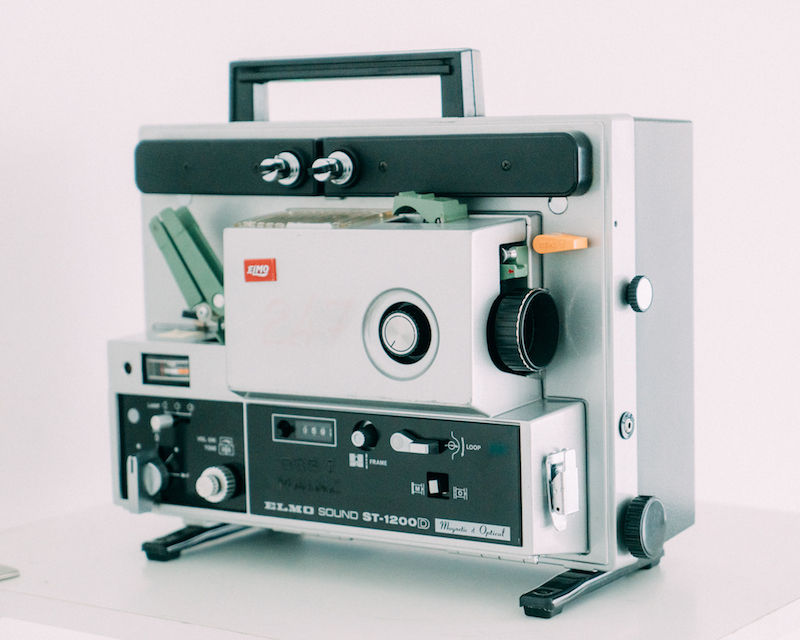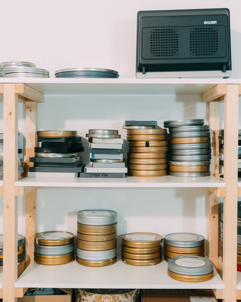 The Raum is her workspace; with its open main area and high ceiling, it resembles a literal white cube. Along one wall runs a waist-high shelf constructed to hold the majority of the room’s contents: photos, projectors, tools and many, many rolls of film, stacked neatly in silver and gold tins. “There’s always this potential to see them without seeing them,” says Fanderl, describing the arrangement, “and you can see them only when I run the projector.” Which she does, shortly after.