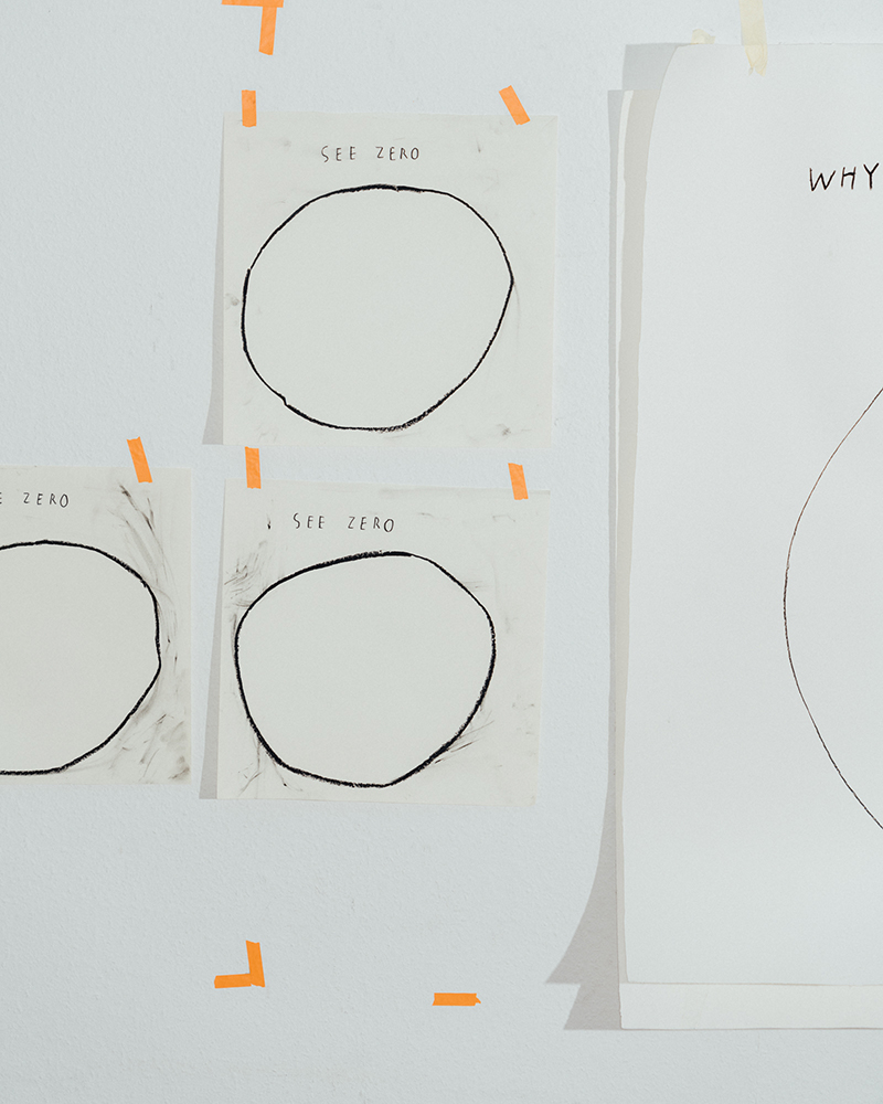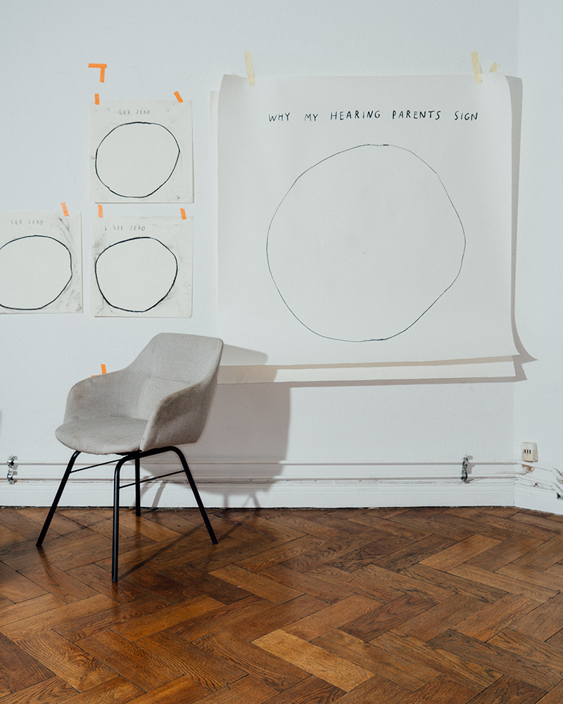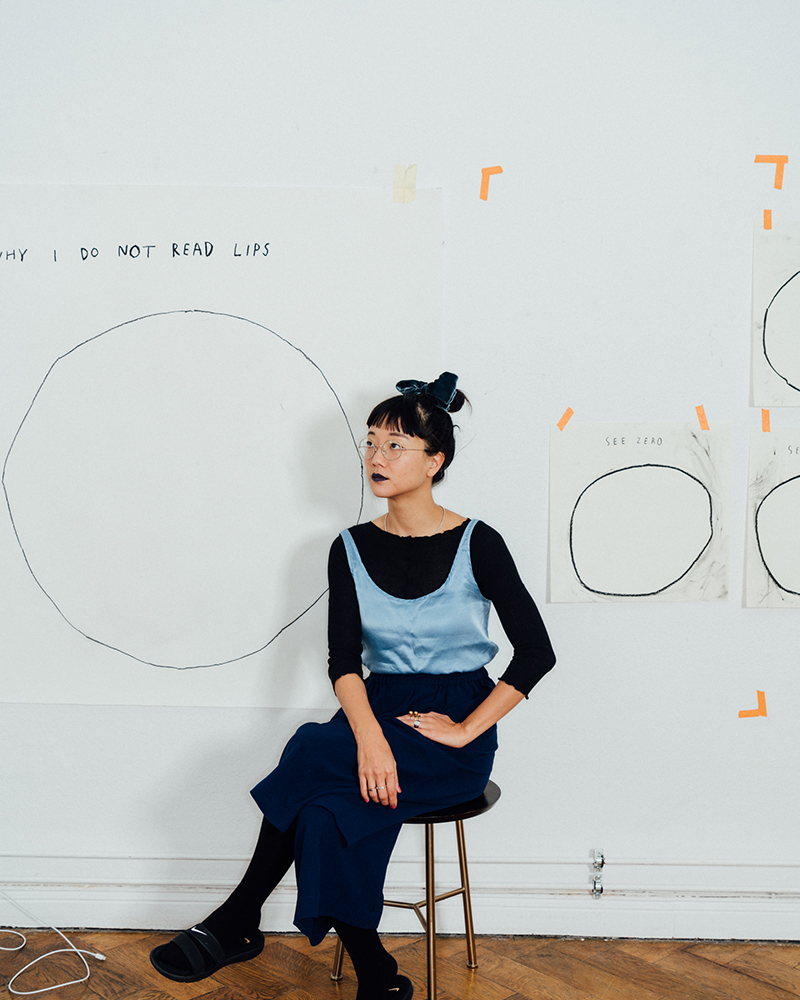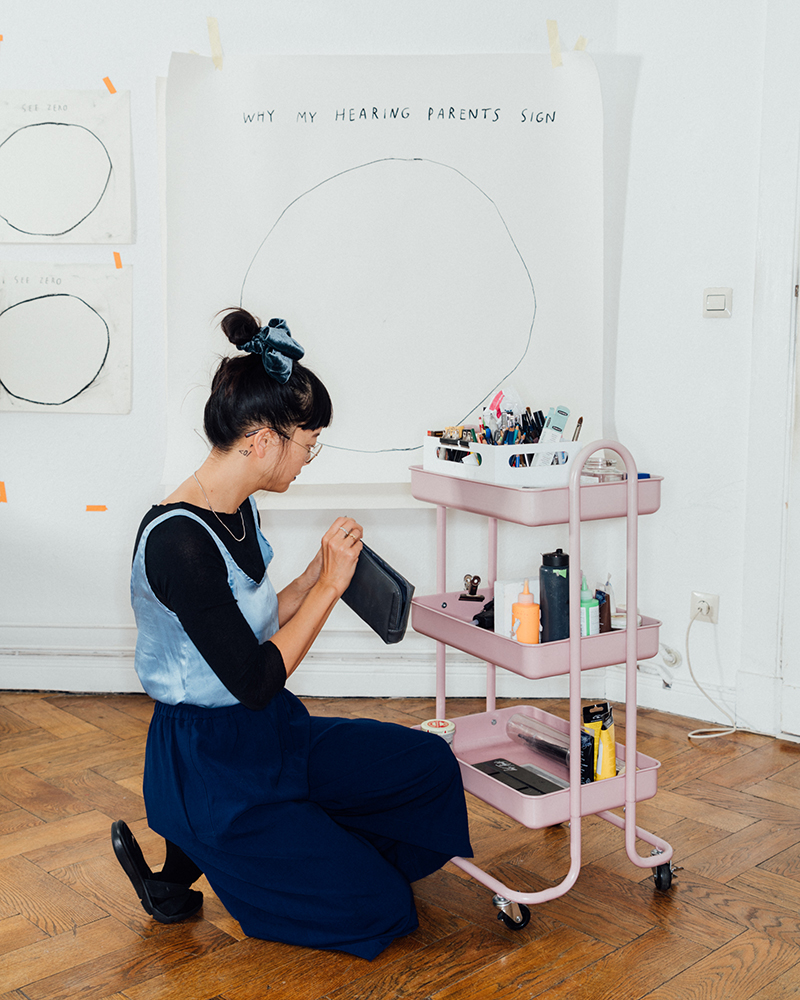 When I visited Christine Sun Kim’s studio, there was a large charcoal drawing on the wall that read “WHY MY HEARING PARENTS SIGN”, above a pie chart she was getting ready to fill in. They’re a response to, in Kim’s words, “people being curious about how things run in my life”. She’s decided to explain it to them. I thought the charts succinctly summarized Kim’s work, which involves sound and communication (with her family, with those curious about her), and also lots of intimacy. There’s the trust involved in allowing someone else to be her American Sign Language (ASL) interpreter or literal “voice” when she gives artist talks, or how and why her partner and baby are learning sign language, or Deaf communities. (And yes, that’s with a capital ‘D,’ used to denote a cultural group, kind of like “French.”).