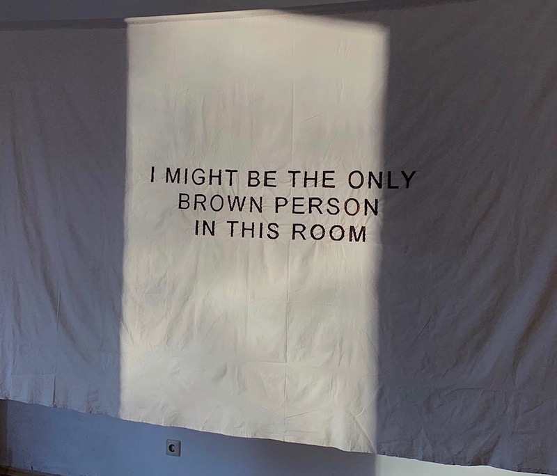 “I MIGHT BE THE ONLY BROWN PERSON IN THIS ROOM” read the black block letters meticulously embroidered on unbleached cotton, whose unfinished edges recede into the white wall of the gallery. Reading these words, I immediately recognize that I myself had brought Carla Abilés into many such rooms, in which she noticed something that I did not. The work, created for the exhibition ‘Uprootings and Reconnections’ at Bardo Projektraum in Berlin last March, confronts me gently but insistently with the reasons for my unnoticing. Perhaps it is because in museums and galleries, biennales, homes, restaurants, playgrounds and parties in Berlin, unbroken homogeneity is a norm that it seems almost rude to disturb. This I perceive, not because I too am brown, but rather another shade of unbelonging. Born of other migration histories, it follows me like a shadow, which I at once fear and hope someone will notice. Perhaps, in my feeling of kinship in a sense of alterity, I resisted noticing unspoken differences. Abilés gives voice to such reflections in a medium almost too slow for words.