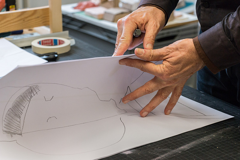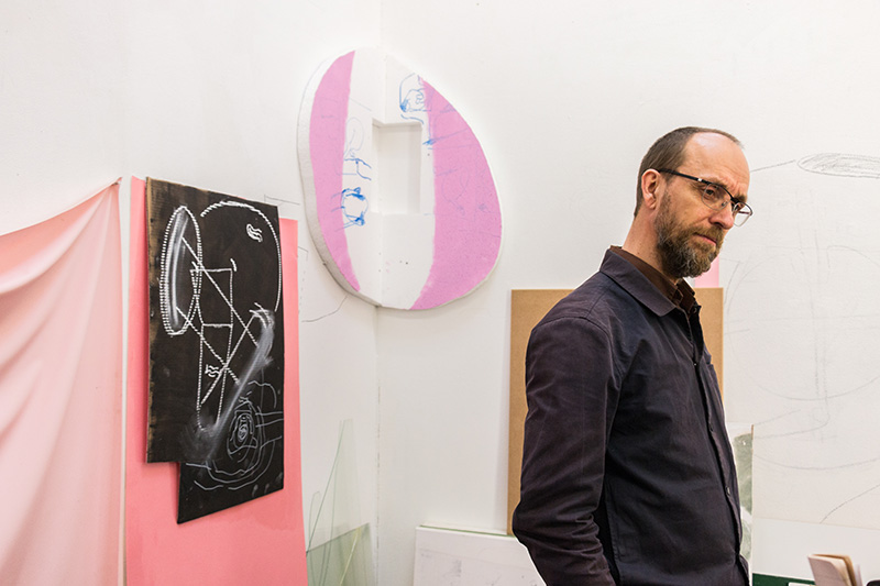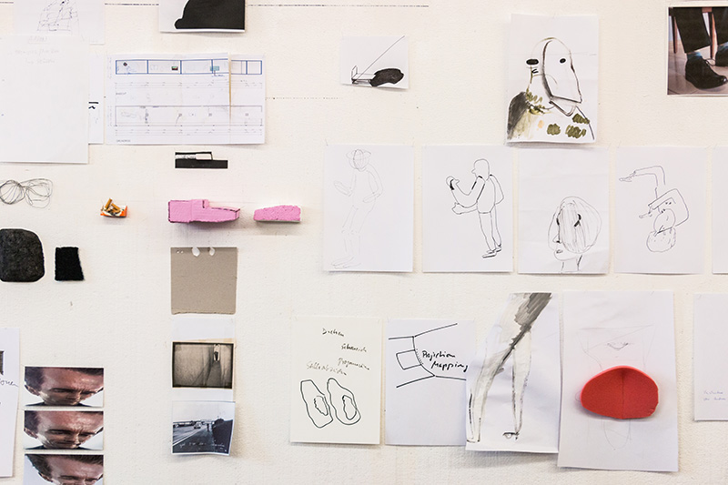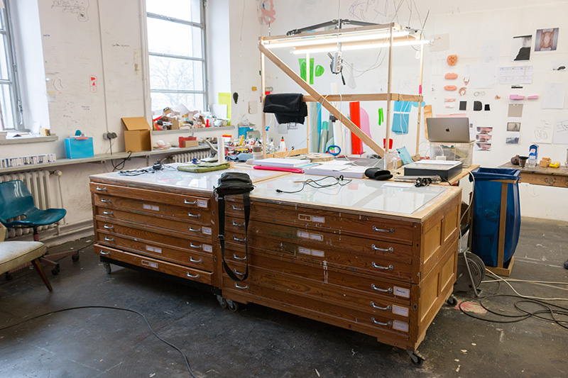 Walking into Heiner Franzen’s bright and spacious studio is like entering into a huge version of one of his drawing room installations. Rather than finding a series of singular works, the whole studio appears like one giant ongoing installation with evidence of Franzen’s working style everywhere. Line drawings, paper cutouts, film still images, sculpted objects, and swatches of various coloured materials cover the walls like the clippings and clues of an obsessive investigation. Outside in the Uferhallen studio complex in Wedding, it’s snowing and peaceful, but inside there is the energy of an artist with a busy mind and a practice that keeps him moving.