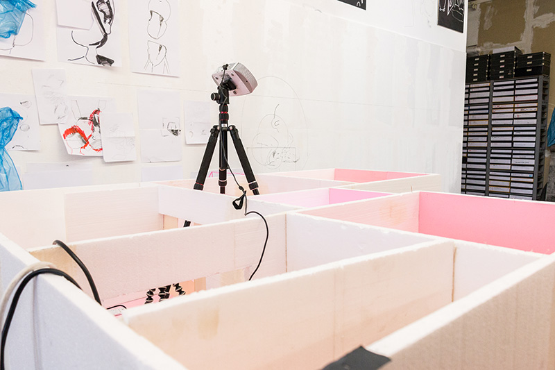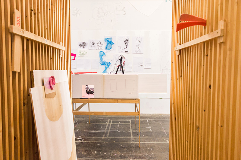 In the middle of Franzen’s studio is a 1:10 scale model of the exhibition rooms at Haus am Lützowplatz for his upcoming exhibition. The walls are bright pink and some curve dramatically to meet the floor. “The halfpipe structure was my first impression at Haus am Lützowplatz, because I knew I wanted to change it into something unrecognisable, where the wall ends and the floor starts.” The video projections will encroach into the viewing space, where wall and floor no longer separate viewer and artwork. Breaking the fourth wall of the gallery and his staging of movement harks back to hours of training spent doing live drawing in a theatre, and links to a broader aim to stage new viewing experiences in a time when we experience the world largely through screens.