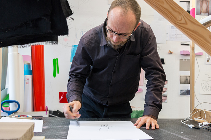 Franzen has a passion for, even an obsession with, film. Stills from well-known films—’Terminator 2′, ‘The Shining’, Pasolini’s ‘120 Days of Sodom’–make their way into his collages and videos. Some sculptures and installations are, themselves, like giant film projectors. His work is often described as being like a projection of his mind, pen tip acting as the moving image. In ‘Kartenraum’, 2014—a series of live drawing performances where Franzen stood inside or behind a fabric screen—his drawing became an animated story happening in real time. “I’m not so interested in narrative where there is 90 minutes of something happening, it’s more about how one central image works in my brain. My videos are always loops, because I’m interested in how time works for us.” In his exhibitions, viewers move through a network of clues and fragments, piecing together their own narrative as certain shapes, figures and film images speak to them or trigger a memory.