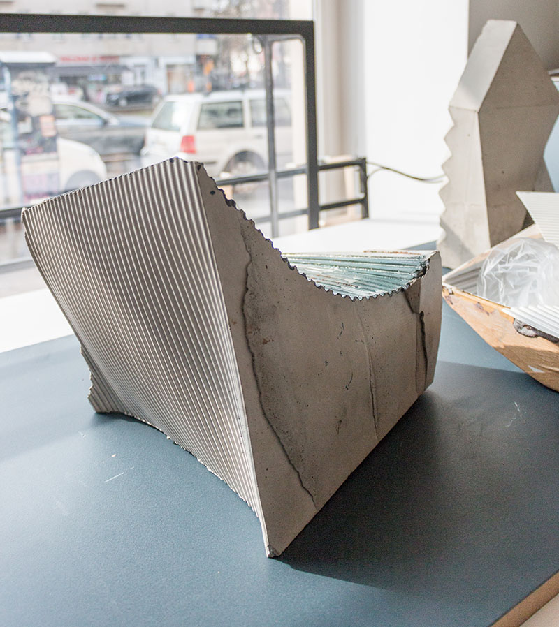 The works Kegelmann is scheduled to show at Lage Egal will be constructed from two concrete elements that she has exhibited before. She demonstrates the beginning of her process, spraying a mould that is evocative of a Doric column fragment with natural food colouring and then coating it with chocolate. Later she will fill it with nuts and other ingredients about which she remains slightly unsure. This food element will be displayed atop a concrete structure in the gallery. Kegelmann resists attributing her inspiration to architecture, but many of her works are evocative of architectural objects. She displays mousse-like blocks of pastel and gold coloured goats milk and blackberry creations on wedges of concrete. She places pieces of sourdough wrapped in foil alongside concrete also wrapped in foil. Often her works take up the whole space; small geometric, muted coloured pralines are hung like beads on a necklace, from wires that start in the ceiling of the gallery. The final sculptures are typically a hybrid between durable and edible materials. “I like concrete, I like steel, I like wood. I find pieces of wood and I try to work with it,” she explains. Although Kegelmann has no formal training or tools to work with these materials, she still manages to craft architectural structures that perfectly balance the delicacy of her edible creations—and that outlast the consumable components.
