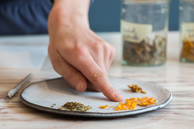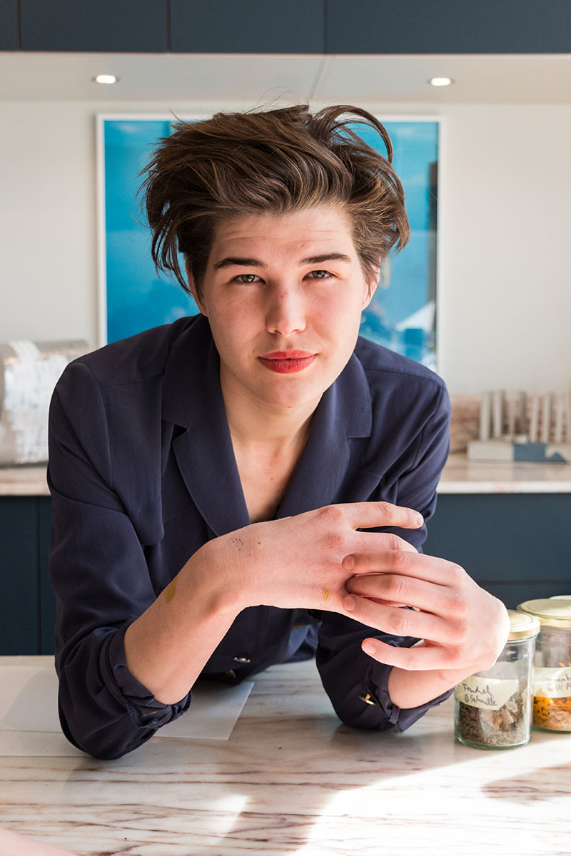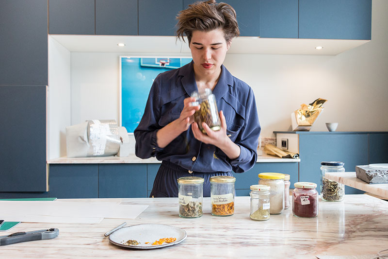 Partly funded through a KickStarter campaign, the space is a fully functioning kitchen designed by her befriended designer Cäcilia Verweyen to enable her to experiment with ingredients and create both large-scale and small-scale sculptures. When we arrive, she is working on a piece to be shown two days later at Lage Egal. Despite this upcoming deadline, there is an aura of effortless calm and at no point does it feel like she is rushing to get rid of us. The result of extensive knowledge about her material and a devotion to crafting both visually and gustatorily exquisite works, she appears assured in her abilities. The kitchen studio space is far from bare, but everything does have its place, allowing Kegelmann to work in a methodical and smooth sequence of planned steps and creative energy. Jars filled with dried fennel and other experiments line the cupboards; chocolate is tempering in the oven ready to be used; and concrete materials that she hopes to incorporate into future projects sit around the edges of the studio. Everything in the space is coordinated through a muted colour palette, and the artist, in a dark navy jumpsuit, befittingly matches her setting.