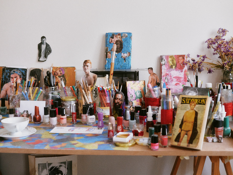 None of the space in Davis’ studio has gone to waste. There is a desk and a chair, where she paints, a massage chair for midday naps (Davis gets up at 5AM) and the remaining books, zines and artworks are placed on the floor or shelves near the wall. There is a certain order to the chaos, with said “chaos” mainly present on the walls–posters from events and happenings, her own and those of others, meet printed photographs of men and, of course, “Babs.” Her studio is incredibly potent, so rich with what was and what is, like a mood board visualizing every thought or source of inspiration. An array of multicolored nail polishes adorn the tabletop, recycled yoghurt jars house felt tip markers and other tools; a bottle of craft glue and some costume makeup remind me of an extensive material list of one of Davis’ pieces at the Gropius Bau. The workspace itself feels quite small, not unlike her paintings, which range from matchbox to postcard format. While discussing her paintings, she mentions that the nail polish and makeup left in the studio represent just a fraction of what she still has at the museum. They were left behind from her elaborate site-specific additions to the wall, created for ‘Fabelhaftes Produkt.’