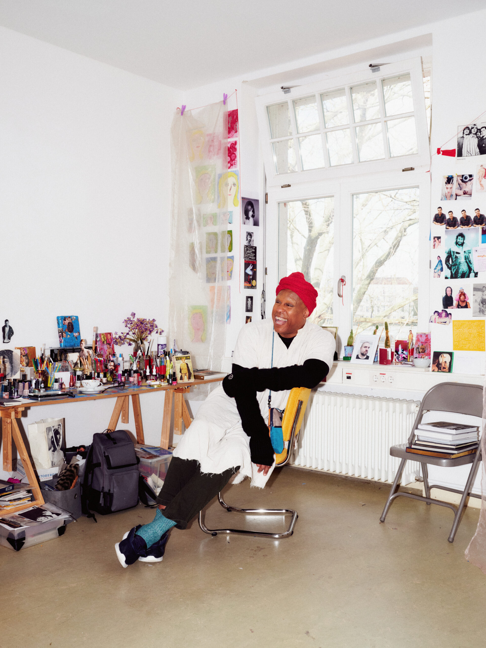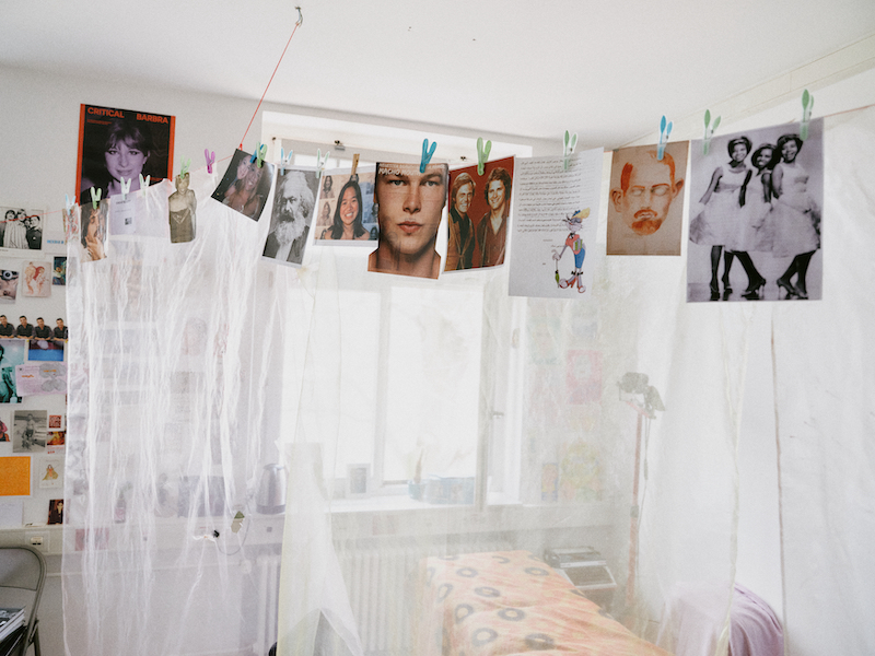 If you have been to Gropius Bau recently, you may have seen Vaginal Davis’s studio. Not directly, but the sheer curtains and ad hoc images strung across clothes lines in her new solo show are straight out of her studio’s interior design. The Los Angeles-born and raised Ms. Davis has been in Berlin for 20 years now, and her first comprehensive exhibition in Germany marks the occasion. From zine-making and performance to film and painting, the exhibition ‘Fabelhaftes Produkt’ at Gropius Bau presents an overview of the artist’s career from the early 1980s to the present day. Visiting her studio feels like an extension of the show. A desk full of nail polish and cutouts of “hunky” young men, magazine and image clippings plastered across every wall, and several photos of Barbra Streisand throughout the ages–Ms. Davis is a self-proclaimed hoarder, and punchy pics are her vice.