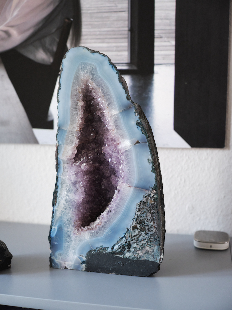 Drawings are placed on the left side of her desktop computer, which is a lavender shade and matches each of her notebooks of the same hue. Between the geodes and books ranging in title from ‘Designs for the Pluriverse’ to ‘Sciences from Below–Feminisms, Postcolonialities, and Modernities,’ Tikka’s fascination with the inextricable link between cultural history and biomedical sciences becomes apparent. This topic spans her practice, notably in her work ‘ÆON’ from 2018, which leans into the philosophical question of ageing and eternal life. Based on research in gene-editing technology, the work culminates in a series of photographs–one of which is hung across from where we are sitting. Showing a couple sharing a tender, sombre moment, with some 40 years between them, the speculative scenarios that form Tikka’s oeuvre approach the social dimension of the scientific research they are based on.