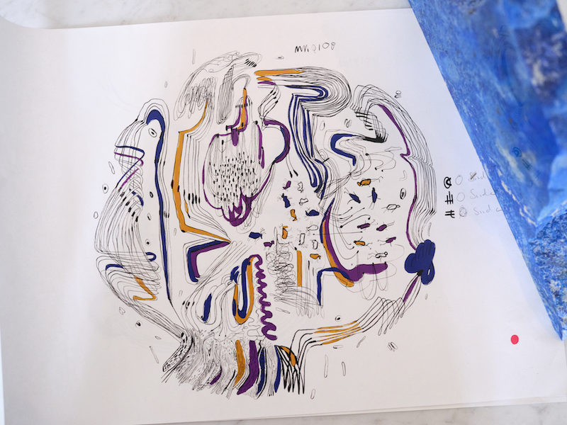 Most of Tikka’s work takes place in a laboratory or digital setting, which somehow makes visiting her home studio all the more intimate. The space feels more like a pinboard than a traditional artist’s studio—each aspect, from the books to the drawings, feels like a representation of what Tikka’s practice is. As we get a glimpse into the drawings, films, topographical maps and more to be shown at the Schering Stiftung in April, we also get a glimpse into our climate future, decided by our current actions.