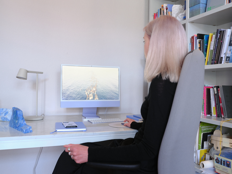 While a lot of her work takes place outside of these studio walls, Tikka uses her desk space to edit footage, create drawings and write scripts. For Tikka, this is when her creative process often begins. Piecing the story together gives her the space to experiment, receive feedback and creatively tackle her scientific subject matter. Tucked to the side of her desk, Emilia’s drawings, made in collaboration with illustrator Anna Stolzman, are quite different from the visual style of her latest film. Black fine liner and colored marker adorn the page, what could be scribbles might also be the double helix structure of DNA. Small reindeer are cut off from the human figure by strands and strokes of colour. These drawings visualize our previous conversation, like a mindmap, blending Oula and Emilia’s worlds.