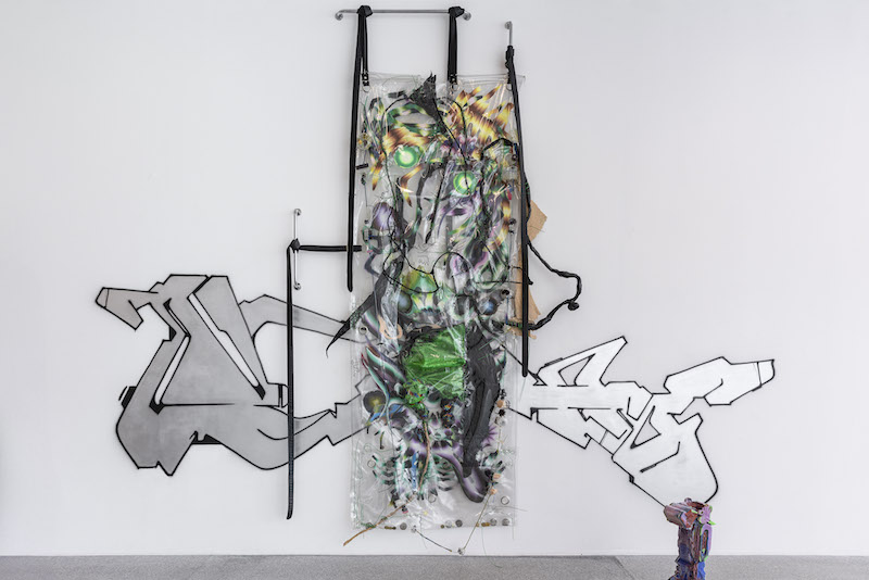 KAYA (Kerstin Brätsch & Debo Eilers), ‘Swarm Living is for Bodybag ONION BRAID,’ 2015, with N.O.Madski Style, 2025, N.O.Madski: ‘Glyphtolyte,’ 2025, courtesy of the artists and Deborah Schamoni, installation view ‘Graffiti,’ 2025 at Museion // Photo by Luca Guadagnini