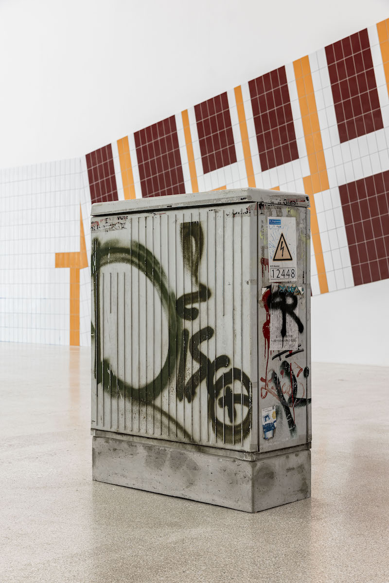 Klara Lidén: ‘Disco,’ 2020, Stedelijk Museum Amsterdam, gift of Sadie Coles HQ, London; Matias Faldbakken, TILE ESCALATION, 2025, Courtesy of the artist and Galerie Neu, Berlin, installation view from ‘Graffiti,’ 2025 at Museion // Photo by Luca Guadagnini