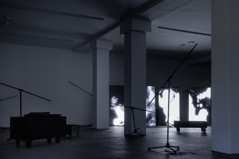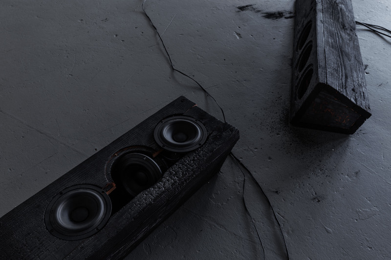 MT: This might be the closing chapter of a body of work I’ve been developing over the past years. As someone trained in moving-image, I often worked with very bright colors—yellow, blue, green. But this project is reduced to grayscale. It evokes a studio that has been scorched and burned, a kind of an abandoned dystopian production set. The image on the screens is a hallucinatory, audio-responsive visual—for which I worked with Tim Novikov—its purpose is simply to brighten the space. The installation is made from charred objects, like microphone stands and speaker towers that play a processual composition, with no beginning or end, in this dystopian setting it is only the soundscape that remains and continues infinitely.