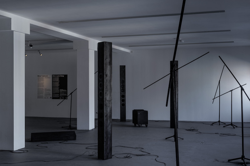 Miloš Trakilović’s solo exhibition ‘Not a Love Song,’ currently on display at KW, explores the entanglement of sound, history and technology. The artist trained neural networks on war-zone recordings to detect latent tonalities in the pop tracks from Yugoslavia in the years leading up to the Bosnian War. The result is a dystopian, quasi-production studio filled with a constantly evolving soundscape, where extrapolated fragments are reassembled according to melodic structures commonly found in love songs. This generative work speculates on how cultural production might anticipate the looming catastrophe. We spoke to Trakilović about the persistence of war in cultural memory, the failure of language in conveying conflict and the cyclical nature of violence.