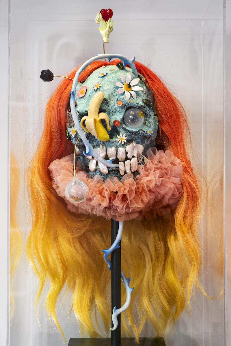 There’s a lot of everything in Shani’s exhibition, which is perfectly in keeping with what might be thought of as the Jencks meta-vibe. A heart floats in the air despite being bound by a chain to the earth. A perfectly formed sphere, black and white, sits on a swirly decorated red carpet afloat a virescent floor, not far from the inverted Borromini dome that served Jencks in life as a jacuzzi. Diagrams of celestial bodies look down from mirrored surfaces above. A wobbly stained glass work misbalances the light from the November London sun as it passes through a door to the Jencks’ back garden and into the space. Then there’s a turquoise—not really caesious to my eyes—skull, festooned with all manner of accoutrements, teeth, springy hearts, a half-exposed banana. It is perhaps a difficult moment to think of the aesthetics of the skull, in a time of merciless global war and, less bleakly, a moment not so distant from Halloween. But thinking about it, that juxtaposition came to seem fruitful to me: we attempt to estrange ourselves from our fears of the most intimate signifier of all, the skull beneath the skin, once goblin season rolls around.