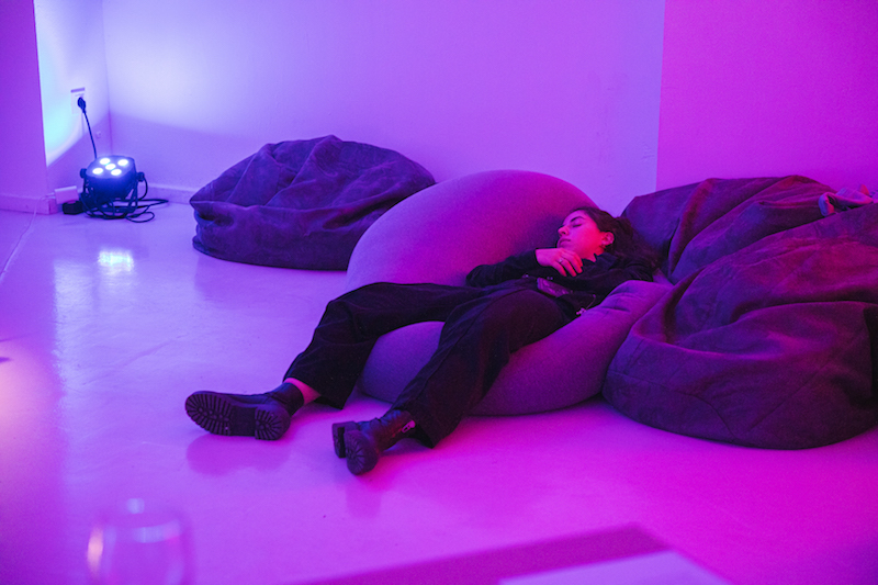 The installation weaves through the space, punctuated by a number of optional activity stations and an abundance of seating—bean bags to sink into, soft sponge blocks that on first glance appear to be concrete, office tables and chairs and a therapist’s couch. A 40-minute immersive soundscape by producer Mankyy plays on a loop in the background. Created for the installation, the track oscillates through samples that vary from soporific, ambient ASMR, melodic, to a conversation that reflects on societal attitudes to rest as something reserved for the afterlife. For those sensitive to noise intrusion, earplugs are provided—another thoughtful gesture in a space designed to accommodate diverse needs.