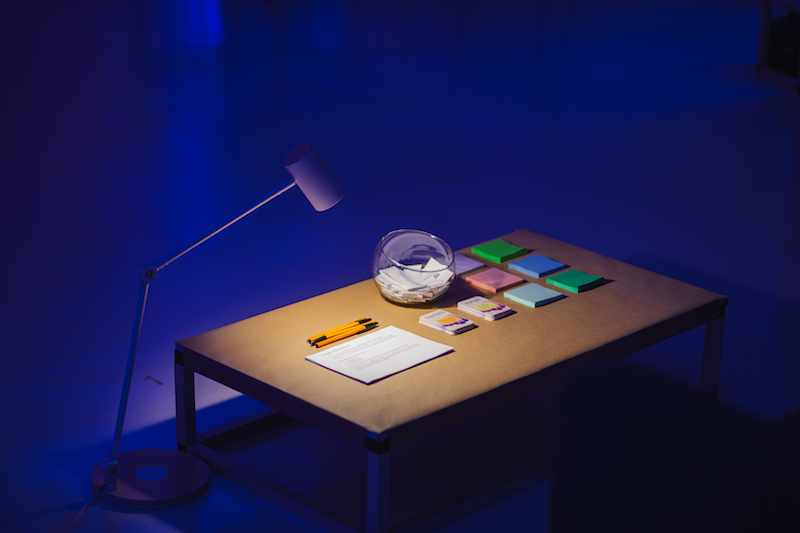 The first interactive element of the exhibition is a card game that prompts visitors to imagine what a “rest service” might look like. We are invited to pull a card that poses questions, choose answers on small slips of paper from a jar and write or draw our responses on post-it notes that can be added to a growing wall of contributions. This wall, ever-changing and unfixed, represents a collective ideation. These activities give us the opportunity to expand our collective understanding of rest beyond the narrow confines of sleep or relaxation. Just as a traditional library space exists to serve the community, the notion of a “rest service” also seems intended to facilitate a community-oriented goal.