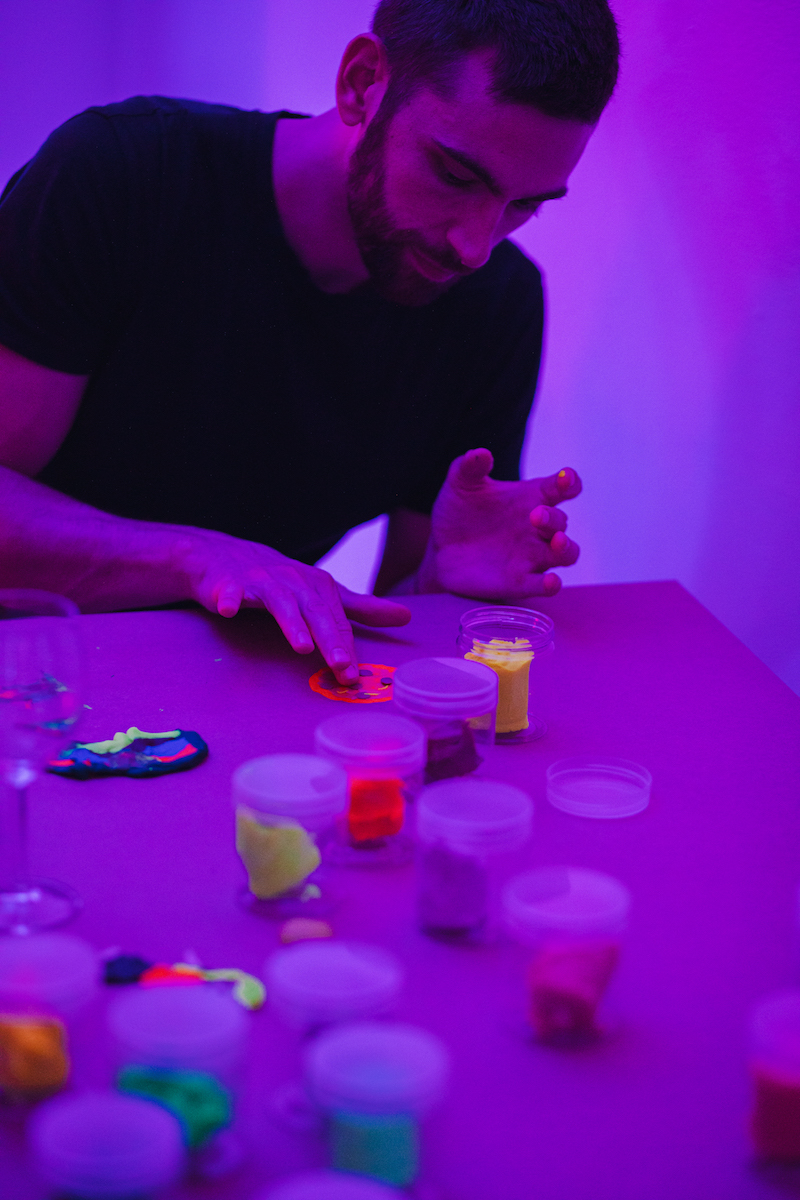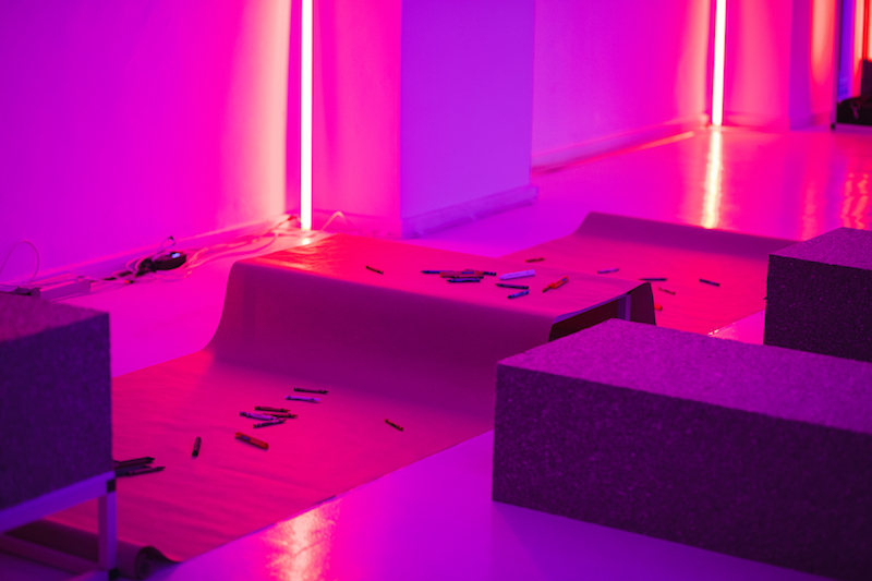 ‘Libraries of Rest’ offers a radically different approach to the detached experience of viewing art against a starkly lit gallery wall. The visual language is not like that of a traditional library—there are no shelves filled with books or desks lined with computers. But it’s interesting to note how the spatial arrangement warmly invites a similar solitary or collective experience of research and reflection. The Mylar sheets divide the space in the same way that bookshelves might, but instead of holding reading material, they reflect the ephemeral thoughts and conversations on rest that are ignited by the exhibition. Their glow and responsive qualities are also key to an immersive spatial experience that encourages visitors to manifest these thoughts and reflections in the form of words, drawings or plasticine creations.