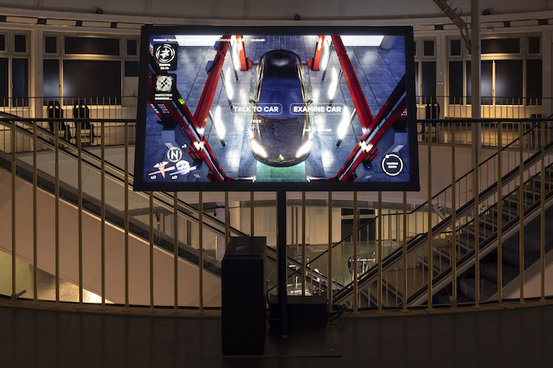 LL: In much of my earlier work, I was thinking about how the first-person point of view in video games is meant to give the player the feeling that they’re controlling the character, they control the camera, they have a position and a certain kind of agency in the world. With ‘NOX’ I was developing that video game aesthetic further. On the top floor, we have a touchscreen-based game and, in the videos, it’s more a cinematic point of view. For both, I’m using a game engine to do things, but what is cinematic and what is game-like is slightly diverged, because of that first-person point of view, which is meant to give the illusion that you are a person going through the world in the game. On a narrative level, there’s the idea of a journey through space; sometimes it’s a person walking, here it’s a car on a journey, in my 2017 film ‘Geomancer’ it’s a satellite. Sometimes a character is literally a vehicle, and sometimes they are just in motion. For me, that’s also tied together with this first-person point of view.