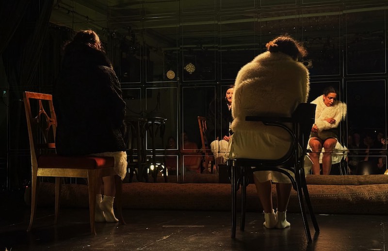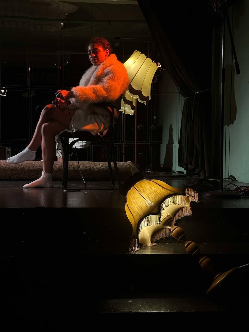The stage of Volksbühne’s Grüner Salon is conceived as a modest interior, sparsely furnished in the style of early 20th century design. A large mirror at the rear reflects the audience, subtly integrating us into the performance and dissolving the boundary between stage and spectator. Two women, one Black (Billie) and the other white (Maria), begin to recount the stories of their lives. Their meeting feels like a reunion—like old friends falling into a deep, intimate conversation. They exchange stories about their birth, origins, childhoods, rape, abortion, love, abuse, passion, addiction, the paths their lives have taken and, above all, about music.