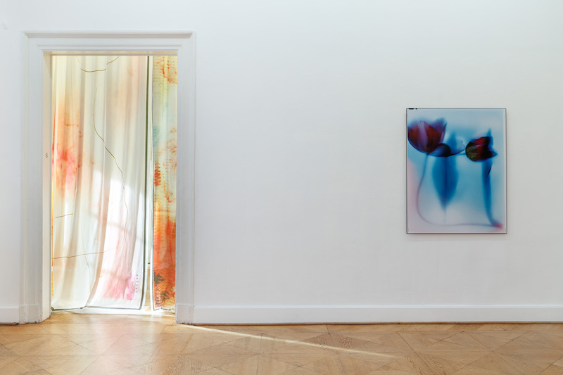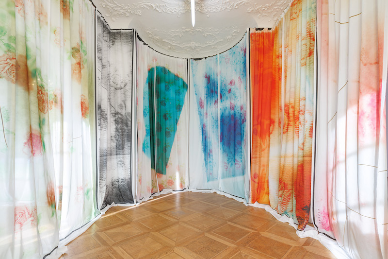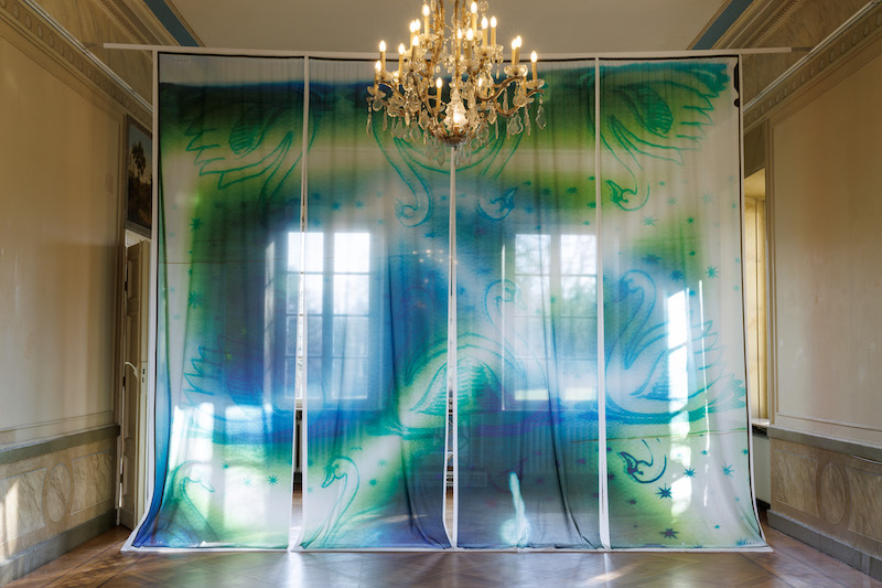 For Alexi-Meskhishvili, the historical events and personal histories informing her work are as crucial as her formal methods. Her scans and photographs of surrounding patterns appear as site-specific installations, such as in ‘flooding the zone’ (2025); a metallic structure going around the room, from which a set of printed curtains hang, following the oval shape of the space, covering the wall and the structure. This “space within a space”—in curator Cathrin Mayer’s words—is flooded with flower patterns taken from mass-produced serviettes. In the middle of the Kunstverein’s main salon, a five-meter-wide curtain hangs across the room. The bright light coming from the wide windows penetrates the cotton fabric that ‘Swan Veil’ (2025) is made of, becoming part of the work while rendering the nature of the photographic image quite obvious and site-specific. The curtain depicts a pattern made of swans, another motif taken from a serviette, scanned and printed on a cotton fabric.