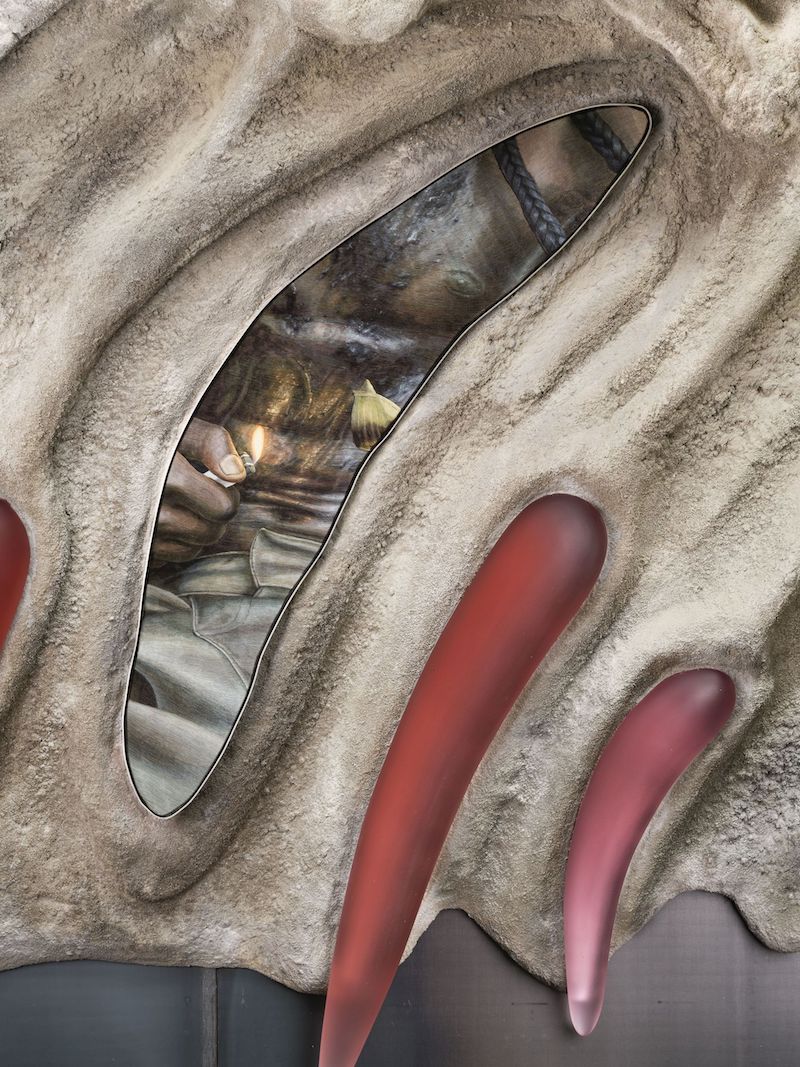 The thread carries through materially. Hosnedlová’s wall-mounted reliefs take on an almost anatomical, exoskeletal structure, unfolding in agitated, unsettled contours that seem to pulse outward. Their coarse, sand-coated surfaces are pierced by insets and translucent, claw-like glass forms, intensifying the impression of latent violence or containment. Shards of pale glass jut out from these casts in rib-like formations, their surfaces recalling sea glass or fossilized amber washed ashore by the Baltic’s cold tide, rendered in willfully soft, almost tender hues. Embedded within their recesses are hyperrealist embroideries that function as narrative vignettes. It is as if something has surfaced. A repressed memory, maybe too painful or complex to confront directly, partially flickering through the rough material in symbolically charged images.