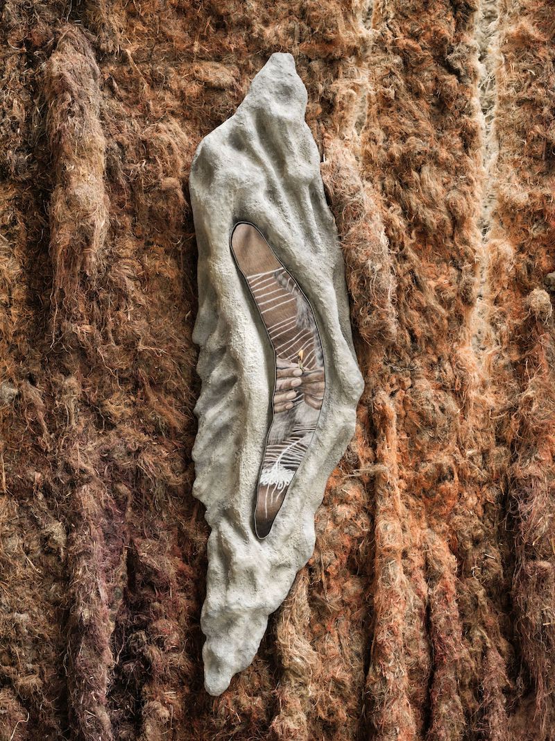 Indeed, the show’s most intimate narratives are woven in thread. The tiny embroidered scenes, often set in sculptural alcoves, feel like private relics in the rubble. One shows a flashlight beam illuminating Black skin; another depicts pigment gently smeared across the curve of a back, or perhaps the spine of an animal. Each small tableau appears devoted to an act of remembrance and care. As the museum notes, the motifs come from video recordings of Hosnedlová’s own performances, bridging personal myth and the inherited tradition of embroidery in a reflection on home, heritage and, perhaps, the sliver of utopia found within. It is here that Svetlana Boym’s observation feels uncannily apt: “While futuristic utopias might be out of fashion, nostalgia itself has a utopian dimension, only it is no longer directed toward the future. Sometimes it is not directed toward the past either, but rather sideways.” These embroidered fragments seem to exist precisely in that lateral temporality. The motif of touch becomes a catalyst for a multiform remembrance: by detailing hands that smear pigment on the skin of another or hold a flame close to one’s own, the works conjure the affective, felt “ghost” of memory itself. By situating some of these threaded reliefs into the fiber sculptures, the artist literally threads the body into the politically charged material that was once grown and woven in the contested, rural borderland of today’s Czech Republic, opening another dimension of intergenerational, somatic remembering.