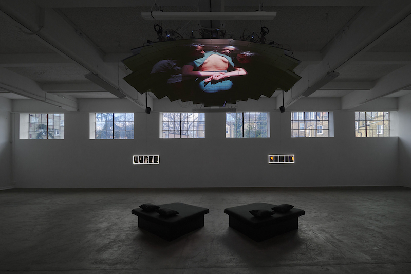 As a child, I often looked up: at adults, at Christ on the cross in church, the tops of buildings, the clouds. I dreamt of gliding through the air like a bird, wandering in the wild, free to go anywhere in the world. There is a lot of looking up in Claudia Pagès Rabal’s exhibition at the Chisenhale Gallery. The centerpiece is a group of flexible tablet computers configured to form one large screen on the ceiling. To view it, the visitor has to lie down on a bed-like piece of furniture provided by the gallery. It’s not quite the same as looking up at the screen as a child at an outdoor cinema, but something slightly novel, instead.