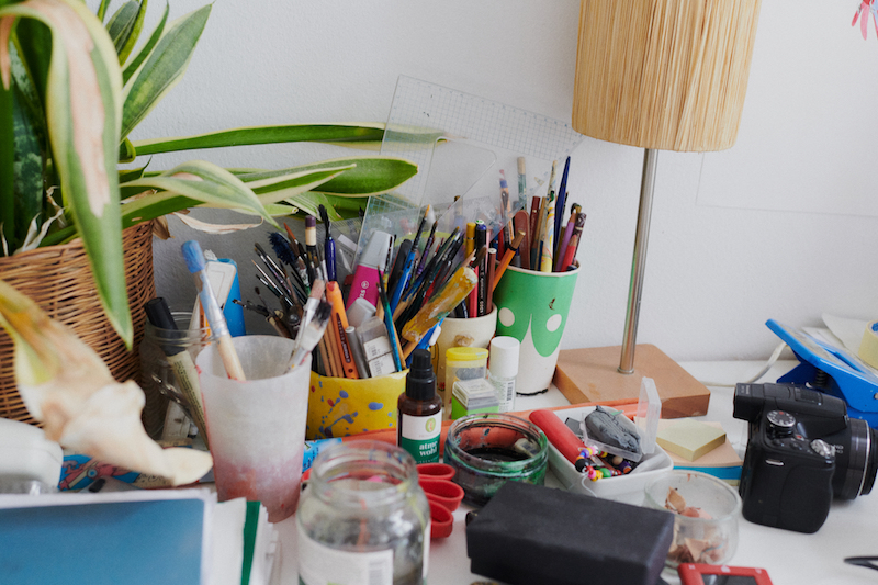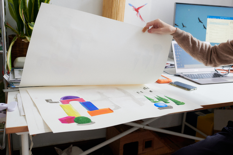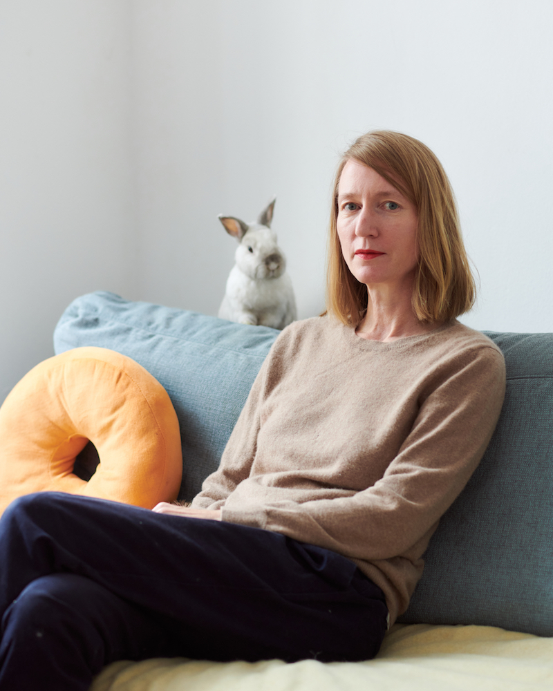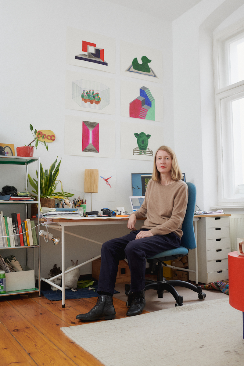 “Sometimes they come and sit with me on the sofa,” Silke Nowak tells us. We are discussing possible locations for the photo shoot after our studio visit. Nowak’s two bunnies have to be in the picture. For now, they have been hiding under the desk and only once in a while, one of them takes the risk of crossing the room to their hutch, which is a large fenced off area that has colourfully painted cardboard housing inside it. The bunnies like to spread out. Some of their cabbage is positioned next to the table where I’m having a tea. “Do you ever take them out?” I ask Nowak. “No,” she says. “I’m afraid that they might like it so much that coming back into the apartment would frustrate them.”