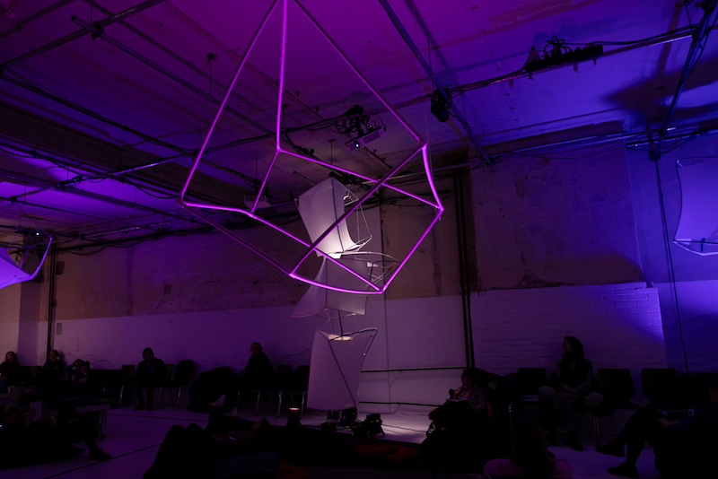 The room fills quickly, and the bean bags strewn across the floor are the first to be occupied. Chairs line the walls and square bench formations are draped with blankets to be used. We all claim a space, headphone-clad, as we listen to an ambient composition, some low cello tones. There are no dancers, there is no stage, but the room is populated with tall structures composed of metal tubing and thin, translucent white fabric. Some audience members dare to approach the tea trolley, while others pick up a stim toy. Those who remain seated are looking around, easing into the novel customs of a relaxed performance. Accompanied by gently fading colored lights, these are the first 15 minutes of the performance.