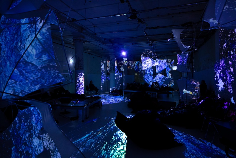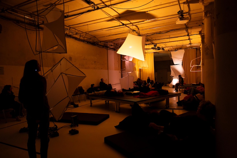 As the piece continues, we slowly settle into our “relaxed” role—some lie flat with their eyes shut, tuning out the visual components and focusing on the audio. When a circular projection hits the ground, several people stand up to look down at it, while others swiftly approach. The performance feels comfortable, rather than just relaxed. This is Baur’s main success: accessibility is not an afterthought, but rather the bedrock of every creative decision experienced during ‘The Disempowered.’ The tent in the relaxed room shares its visual vocabulary with the rest of the installation, the teacups are honest props and the initial feeling of unfamiliarity seems, in the end, to elevate the performance experience.