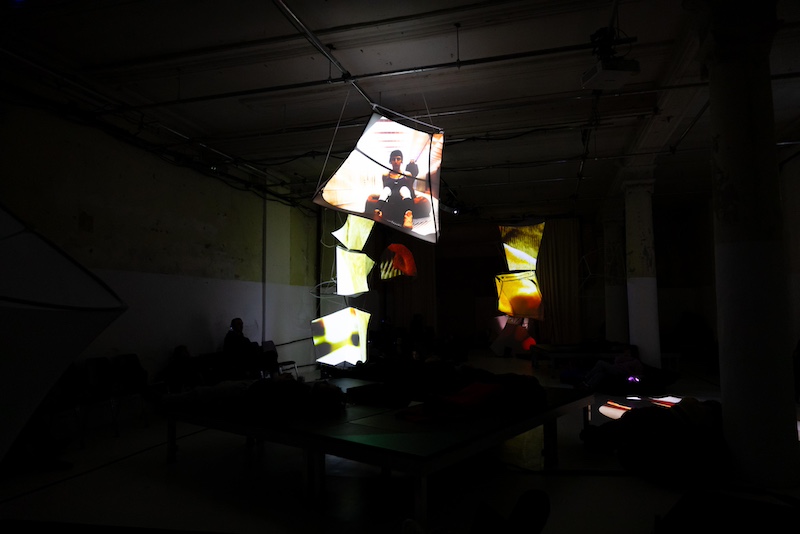 The lights eventually dim, and the structures become projection screens, illuminated with moving images. The audio begins in German, asking: “what do I need to be comfortable here?” A polyphony of English, German and Syrian Arabic voices deliver the script. Baur assumes that the audience is not fluent in all three languages, and invites us to embrace moments of unintelligibility. At the same time, in the name of accessibility, the back of the script includes three QR codes providing transcriptions in all three languages. Baur offers the tools for understanding, but allows the audience members to define their own experience. The traditional mode of engagement with performance, however, is hard to leave at the door. Sitting quietly and judging those who fail to comply, is part of being a faithful audience member at conventional theaters. We sit attentively. Stand attentively. Anything else feels disrespectful, even here, despite being encouraged. In a space that initially appears to house an installation, we undeniably become the performers, fumbling in our attempt to “relax.” Ultimately, the live component of the performance is completed by those who purchase a ticket.