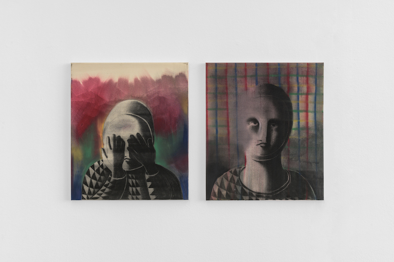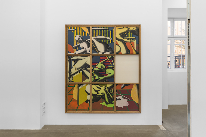 The hard slog continues in ‘wie man so sitzt, sind Tätigkeiten schneller als Gedanken’ (the way you sit, activities are faster than thoughts)—an intricate eight-canvas modular sliding system. Intersecting grids and abstract shapes amplify the sense of a rigid, systemic environment that binds them. The work is even more alive with movement, as more indistinguishable figures dash left and right in another cycle of nondescript labor. Their exaggerated poses and streamlined forms suggest urgency, yet their vacant expressions betray a lack of intent or connection to their work. These figures could easily slide into another frame, another pointless task, without breaking the monotony.