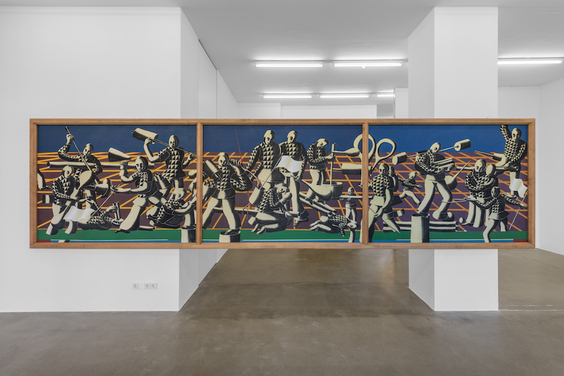 This is most evident in the show’s opening piece, ‘Kein Ende in Aussicht, es sei denn du hilfst’ (No end in sight unless you help) (all works 2024). Stretching an imposing six meters across, the artwork is packed with identical, anonymous figures locked in repetitive, undefined physical tasks. Every figure is a replica—the same monochrome face, uniform body and checkered clothing. The rigid poses and synchronized actions give a sense of industrial monotony. At first glance, the piece looks like a homage to the hardworking, ideal socialist laborer earning their keep. But the illusion quickly dissolves; that emotionless face on repeat can’t keep up the facade. The deadpan expressions show the figures in a trance-like state of working, just cogs in the machine. Despite the vivid, kinetic composition, there’s a hollow stillness to it. The lights are on but no one’s home.