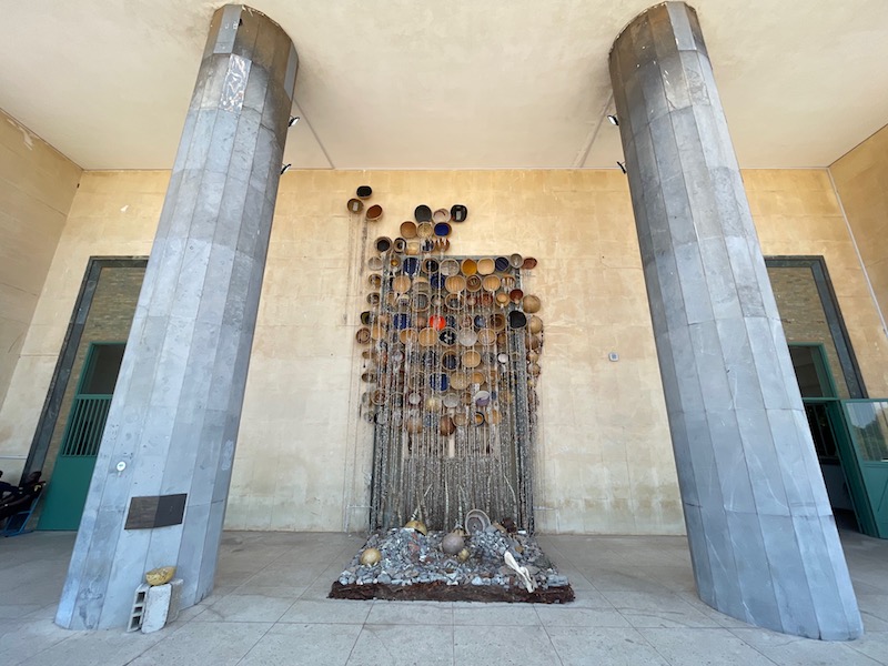 Inside the open-air, tree-filled courtyard of judgments, ‘Murmur’ by Jake Michael Singer (South Africa) travels upward. A Phoenix made of welding rods and automotive paint, it combines organic and technological flocking as a Promethean process that overcomes its crime. At a two-to-one scale to the viewer, it engulfs eyes and body as they dance around it. The earth-red rods evoke the 1s and 0s of space, motion and a wonder at its endurance and inevitable rust—a frozen motion mandala hood ornament for bio-political automotive longevity.