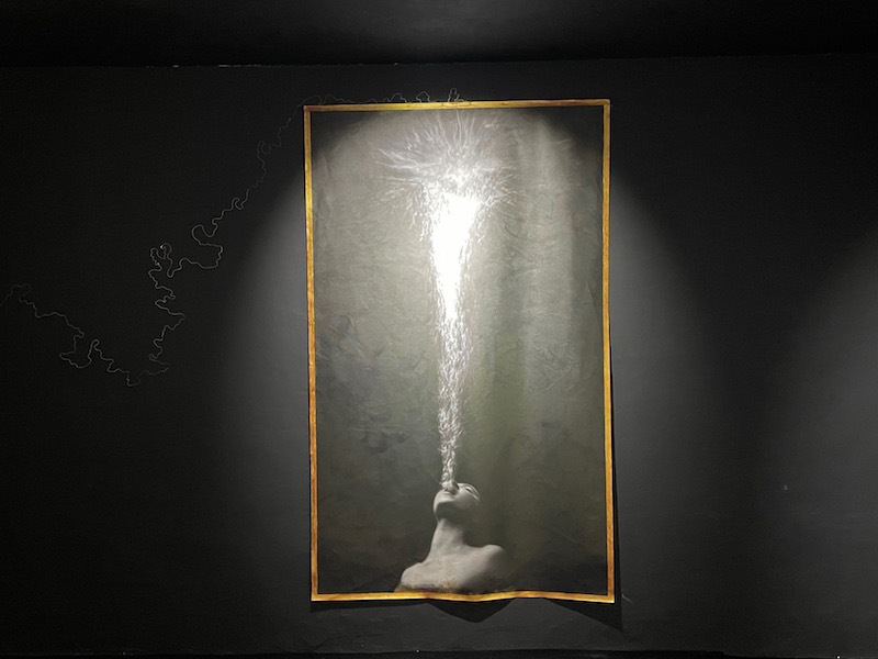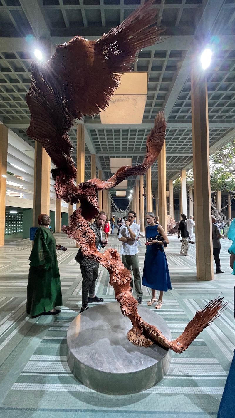 ‘The Wake’ begins with a giant wall of calabash and shells outside the entrance. ‘For Those Among Us Who Inherited Sacrifice, Rasanblaj!’ by Haitian-American artist Gina Athéna Ulysse evokes sifting and gathering from oceans that unite and separate, according to the definition of rasanblaj: a grouping of ideas, things, people, spirits, a gathering, a ceremony, a protest. From a sea bed of stones, the visitor looks up to a vertical wake that carries oxygen bubble shells and tribute baskets. If social and climate change are to be believed as epochal, it is too late for the Anthropocene and we must adapt to warming and inundation—ritualize bunker, code, environment and economic buffers on the way to final oceanic surrender and oneness. Extinction comes in waves. On the other side of the door, however, is the 1.5-meter-high ‘Masai Warrior’ by Ousmane Sow (Senegal), safeguarding memory and identity through whatever permutations may come. The first artist to be admitted to the French Academy of Fine Arts, his massive bronze seems multiplied, with a notable police presence around it and throughout the city. Perhaps they are safeguarding a precarious tradition from the confusion of the recently jailed then newly elected populist government.