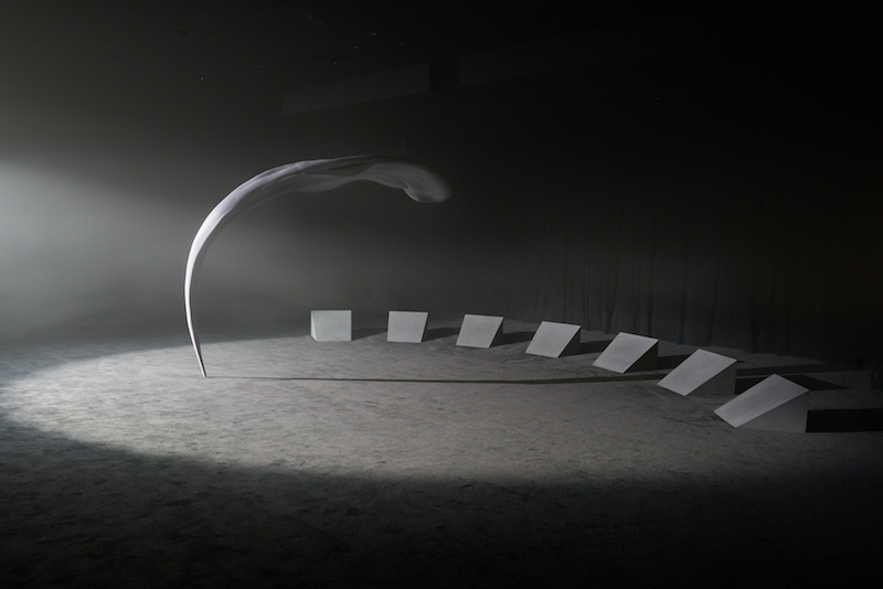 One of the show’s most sensorial rooms contains LABOUR’s multi-media installation, ‘Tower of Silence,’ an “expansive sonic activation” where a serpent-like form looms over seven plinths to the eerie tinkle of a sci-fi soundscape. A ferocious moving spotlight casts a long shadow, slicing the room in half. Pulling the curtain back and stepping into the dark, smoky room, each of the senses sharpens, as if in order to protect oneself from a perceived danger. Perhaps a fear of the unknown or of what lies in the strange room where nothing is identifiable, but everything recalls something familiar yet not quite within grasp.