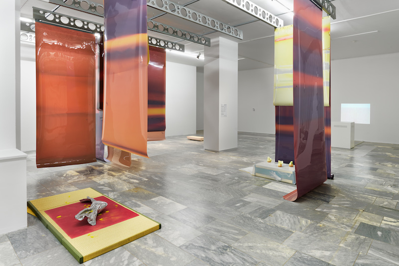 For a show that purports to question the hierarchy of sight over the other senses, the first room of ‘After Images’ contains lots of things to look at. Hanging sheets of light-sensitive silicone welcome visitors into the space, with low interruptions of knotted aluminium and tangerine sculptures wrapped in paper. But as you walk through the group exhibition at the Julia Stoschek Foundation, the other more marginalised senses perk up—you notice the jarring sound of a ball moving around a metal box and an eerie background jingle that has probably been playing the entire time without you realising.